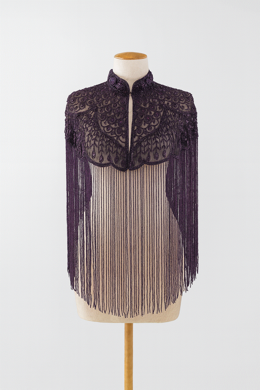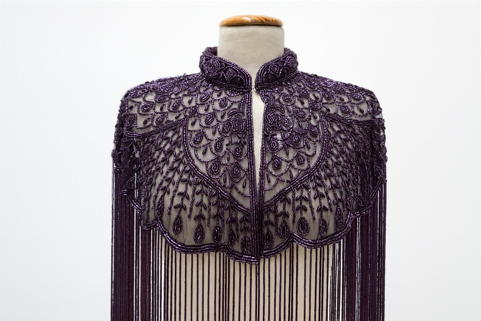 BI52526014 – Preciosa capa joya de fiesta. Se trata de una capa de piedras realizada manualmente con flecos de rocalla morados y un espectacular bordado de rocallas a juego. El complemento perfecto en tus looks de fiesta. Ideal para todo tipo de eventos, cenas especiales o ceremonias como bodas de noche. Cierre de corchete muy sencillo de poner y utilizar.