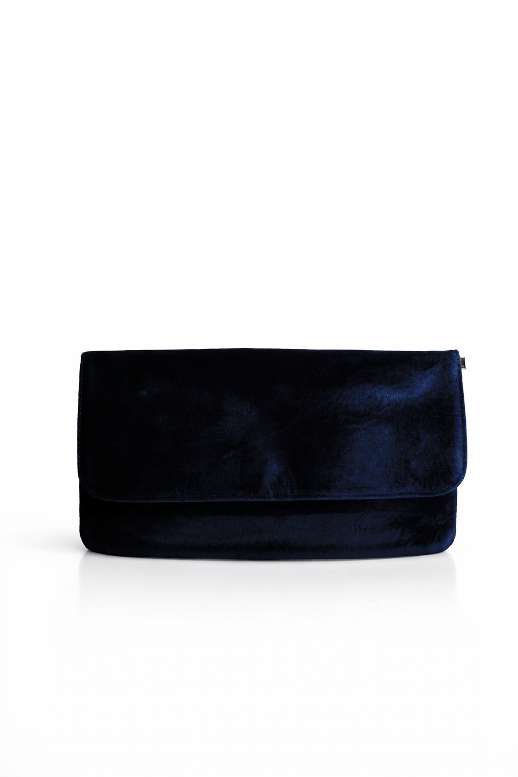 REF: 114370 – Preciosa cartera de fiesta diseñada en tipo sobre, con solapa delantera. Se trata de una cartera elegante, confeccionada en terciopelo muy suave de color azul marino. En el interior se incluye una cadena larga en dorado para llevarla colgada.