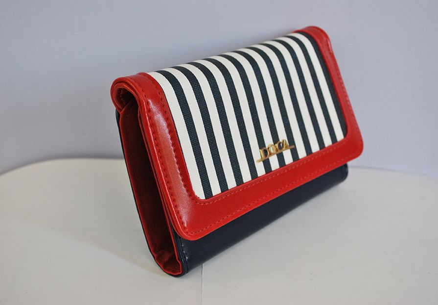 Bonita cartera de mujer o monedero con estampado de rayas en tonos blancos, azul marino y rojo. Varios compartimentos en el interior para el dinero, fotografías y tarjetas.