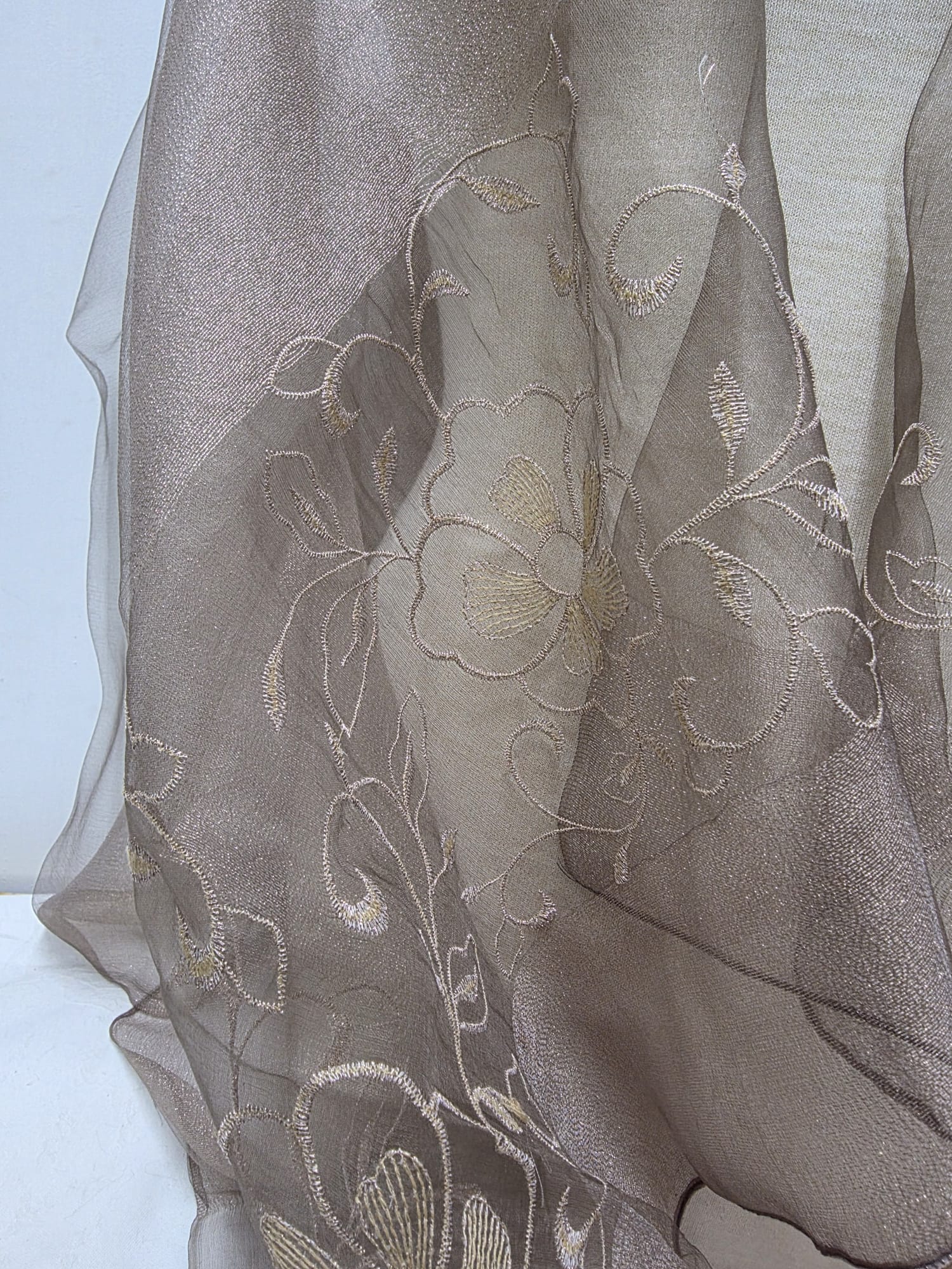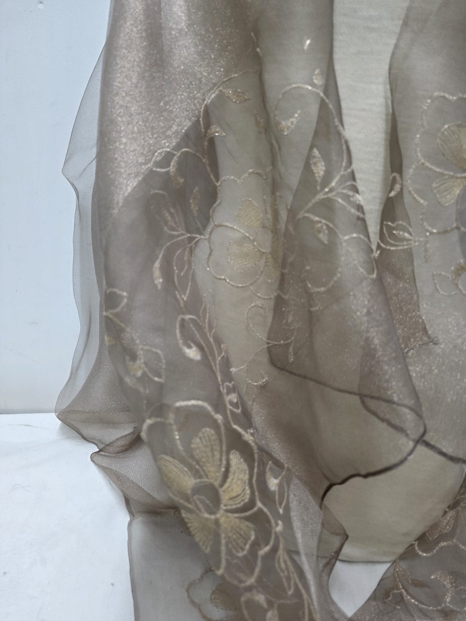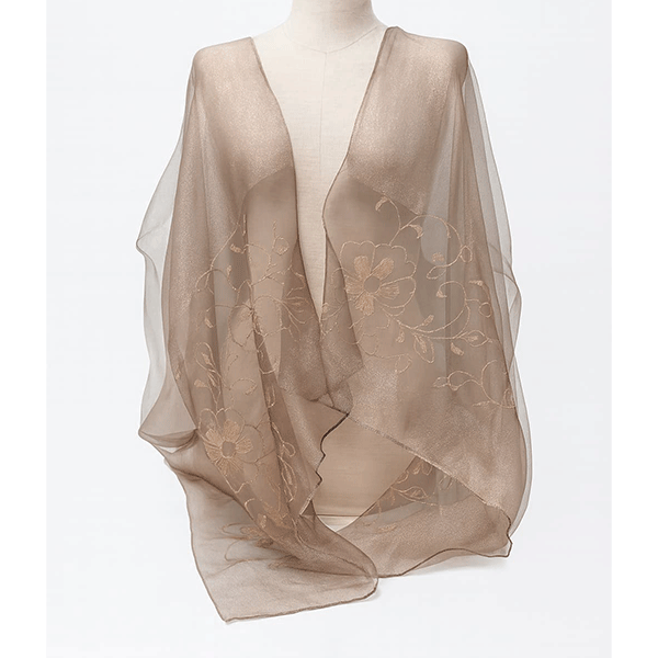 REF: 1533 – Elegante chal de organza en color dorado envejecido – oro viejo decorado con un delicado bordado floral, ideal para complementar atuendos formales o de noche. Confeccionado en un tejido ligero y semitransparente, su diseño asimétrico y caída fluida le dan un toque de sofisticación y feminidad. Es talla única, lo que permite que se adapte cómodamente a cualquier silueta. Perfecto para bodas, fiestas, ceremonias o eventos especiales, este chal es una pieza versátil y distinguida que realza cualquier conjunto con elegancia.