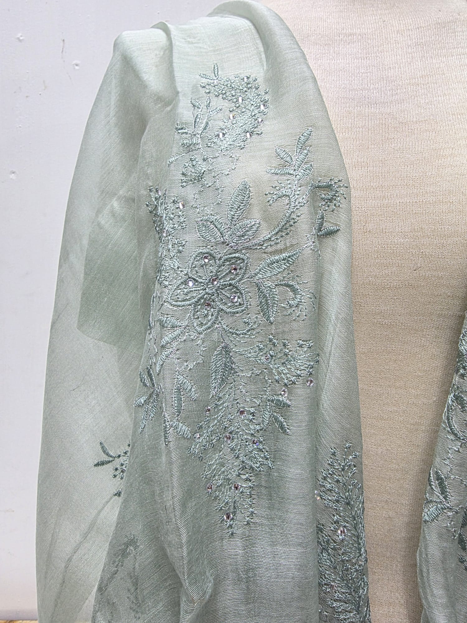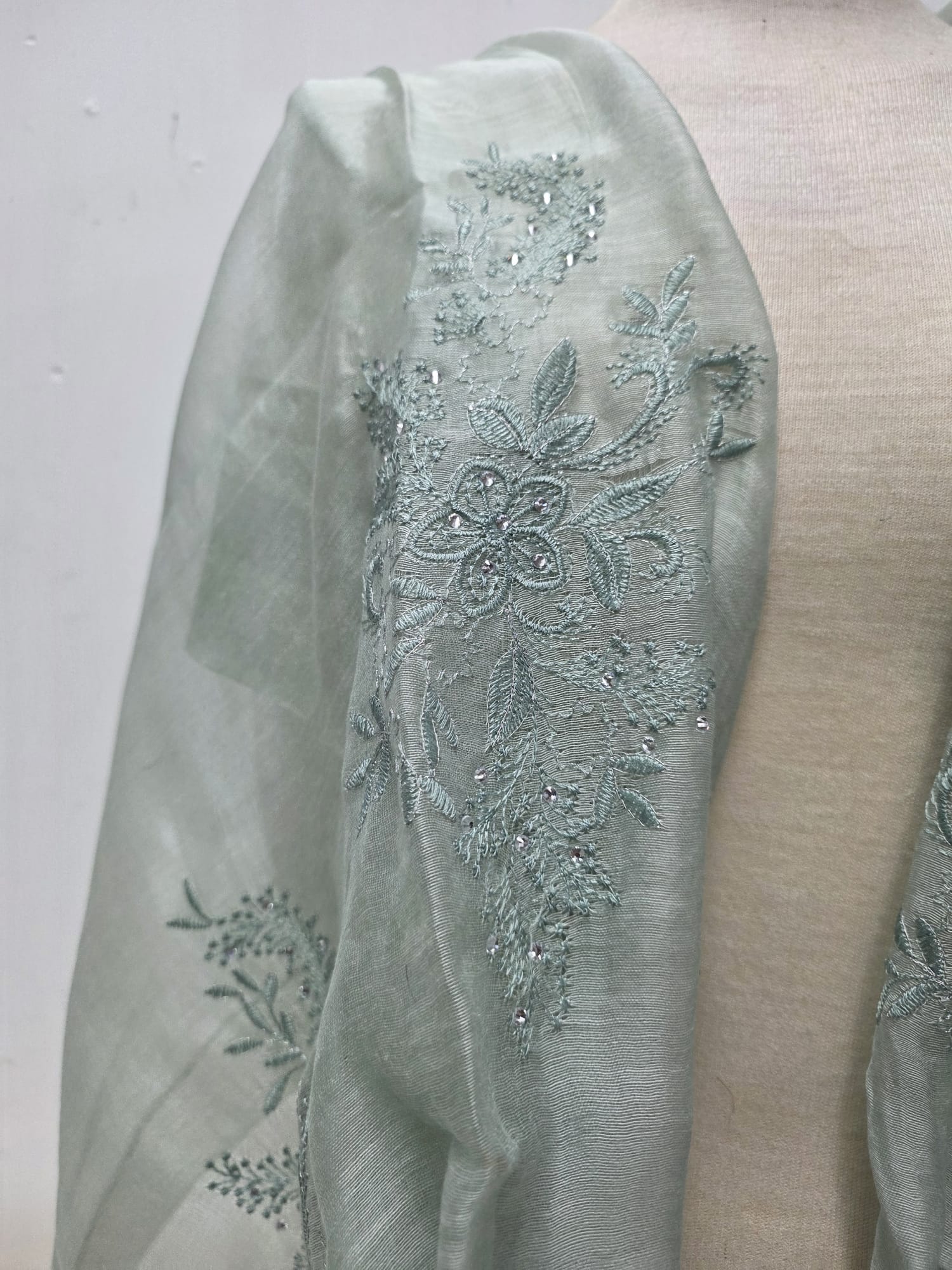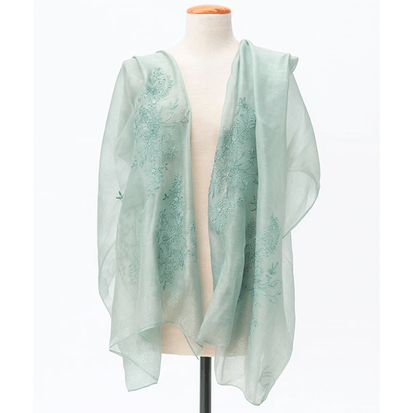 REF: 1545 – Elegante chal de organza en tono verde menta con finos bordados florales que le aportan un aire elegante y sofisticado y pequeños brillos plateados. Su textura ligera y translúcida lo convierte en el complemento perfecto para eventos formales, bodas, cenas o cualquier ocasión especial. De corte amplio y fluido, es talla única y se adapta cómodamente a cualquier silueta, aportando estilo sin sacrificar comodidad. Esta pieza versátil y femenina realza cualquier conjunto con un toque de frescura y distinción.