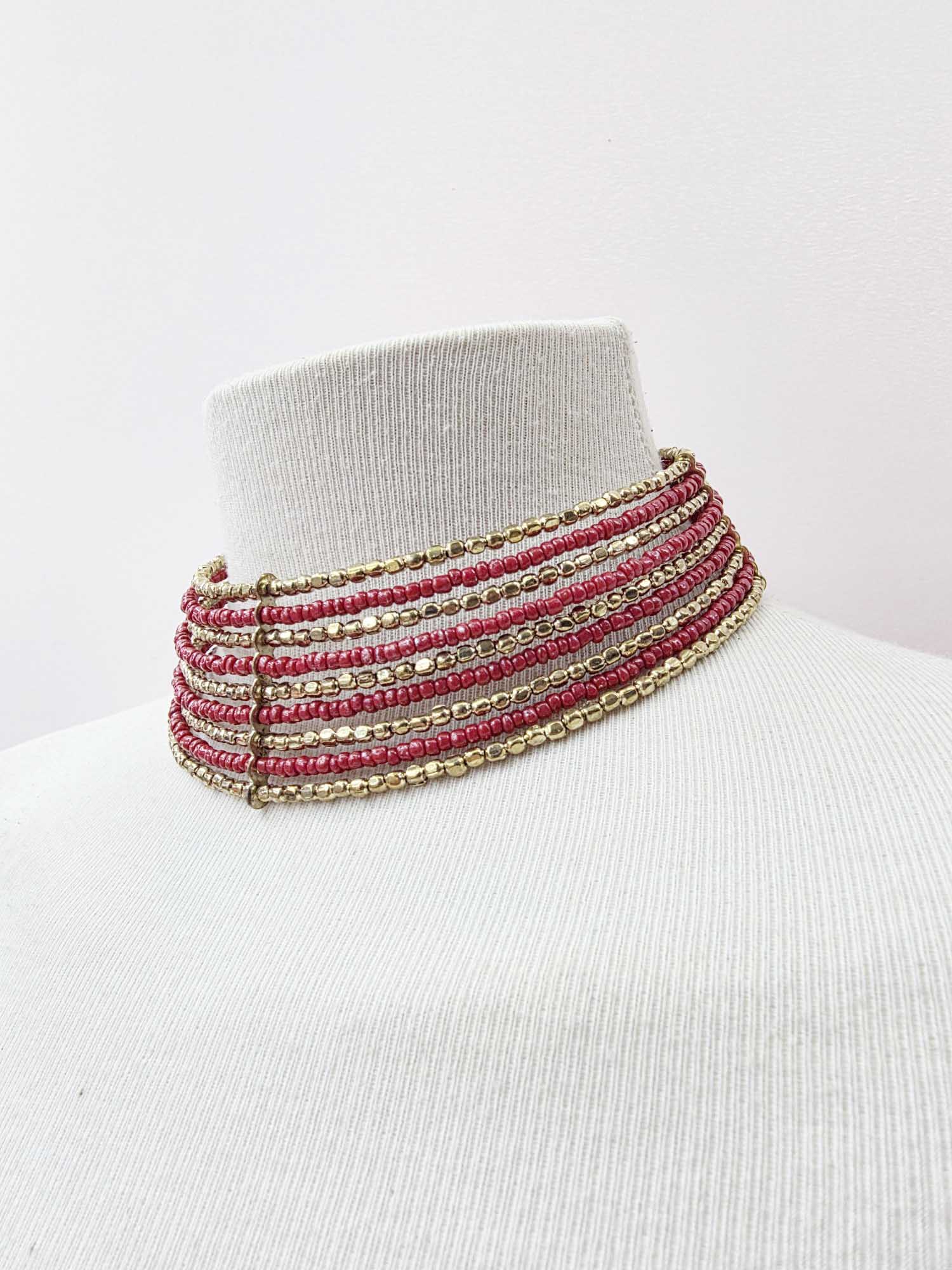 TPB0905245852 – Colgante o collar choker ajustado al cuello fabricado en bisutería dorada con varias vueltas y con elegantes cuentas doradas combinadas con burdeos.