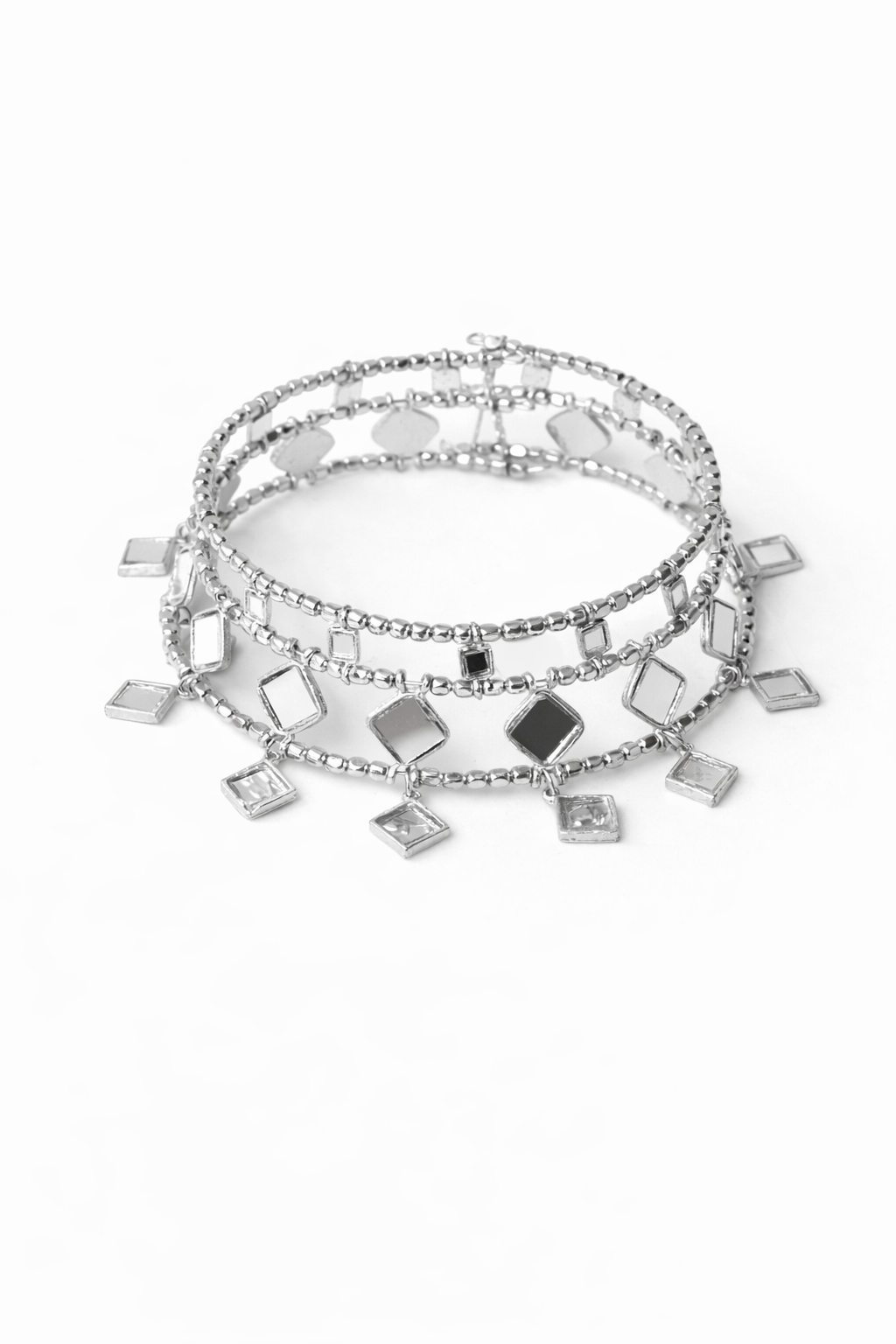 REF: 342200 – Elegante choker plateada de diseño multicadena decorada con delicados colgantes cuadrados efecto espejo que aportan movimiento y un brillo espectacular. Su estructura envolvente combina pequeñas cuentas doradas con piezas reflectantes que captan la luz en cada gesto, creando un efecto sofisticado y muy favorecedor en el cuello.