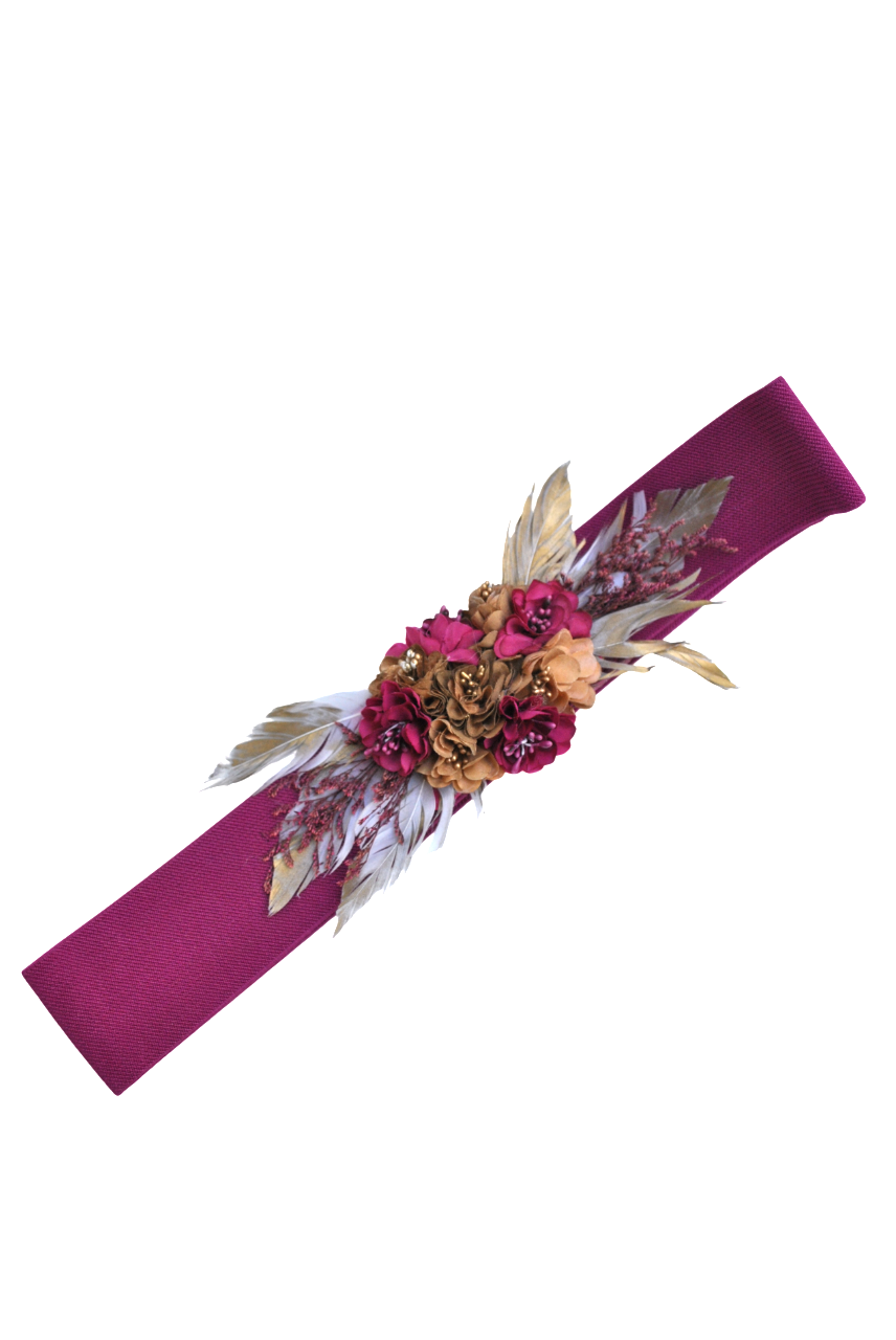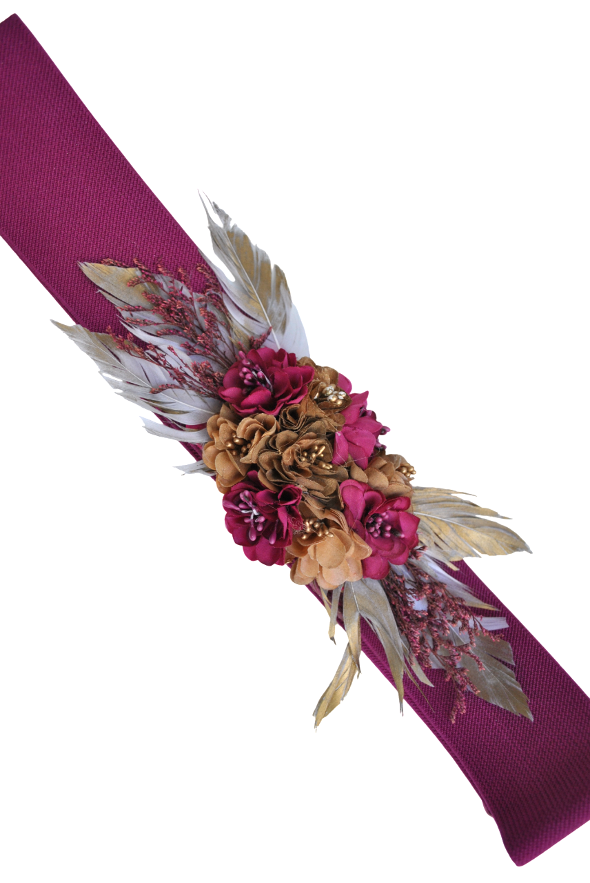 REF: 6012 – Cinturón elástico de fiesta en tono bugamvilla. En el centro destaca un adorno floral artesanal, compuesto por flores.