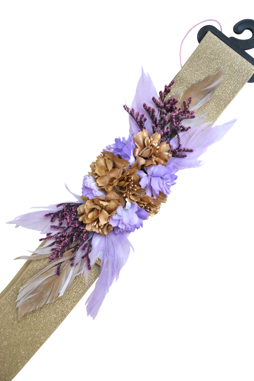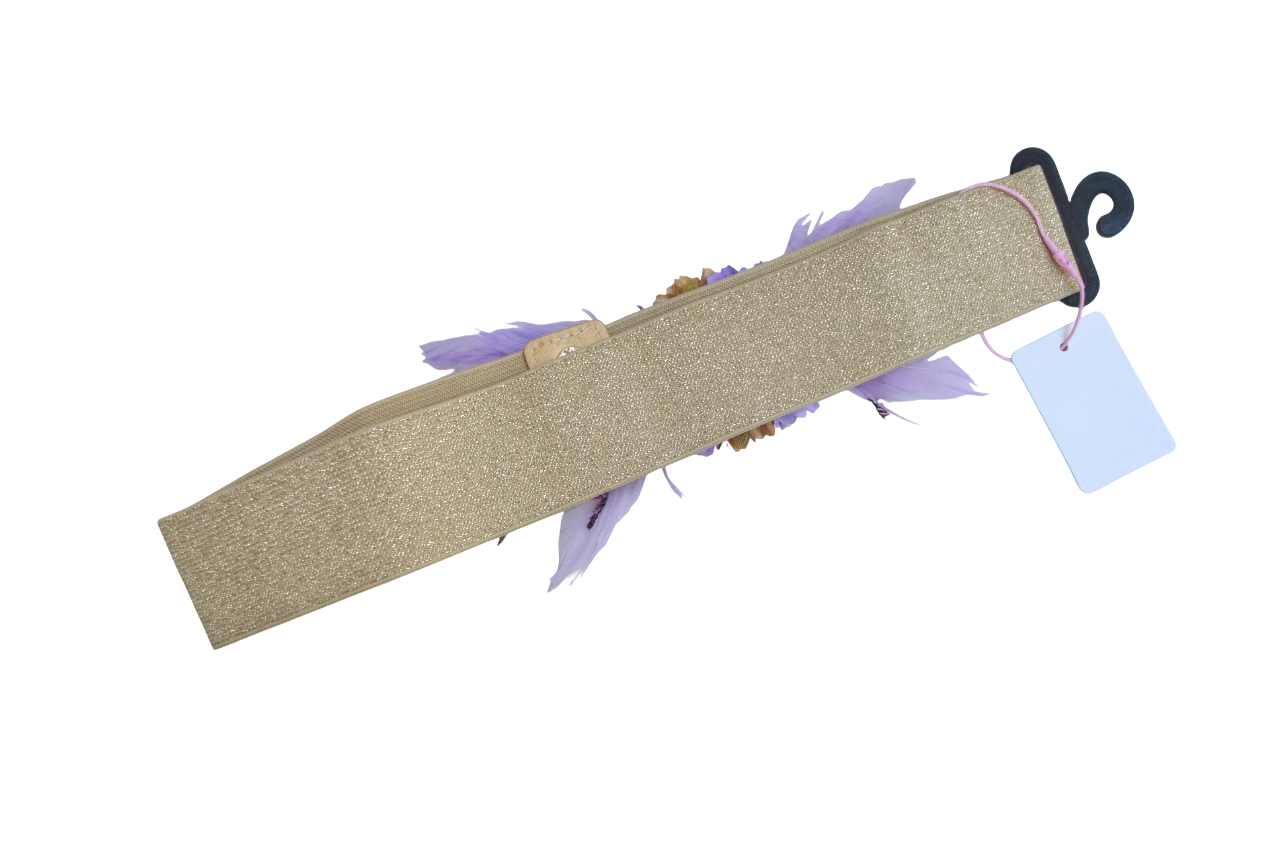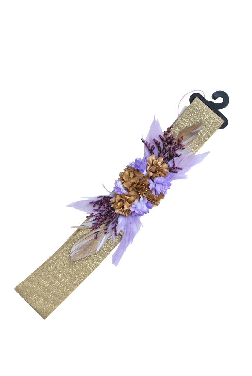 REF: 6012 – Cinturón elástico de fiesta en tono dorado y malva. En el centro destaca un adorno floral artesanal, compuesto por flores.