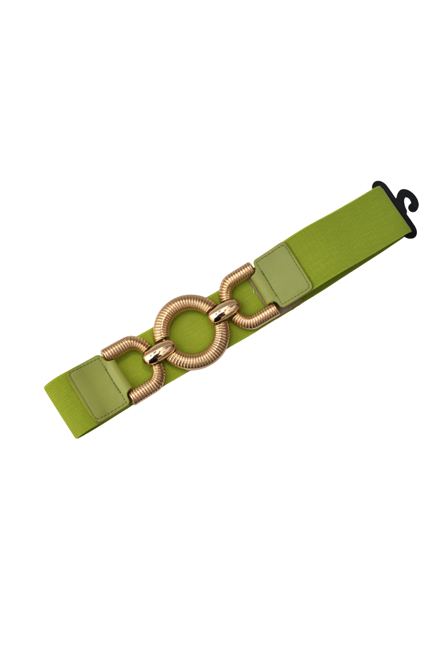 R04/5432 – Precioso cinturón elástico o fajín de fiesta en color verde lima. Se trata de un cinturón de goma elástica en un bonito color verde lima con detalle central de eslabones de metal ligero dorado.