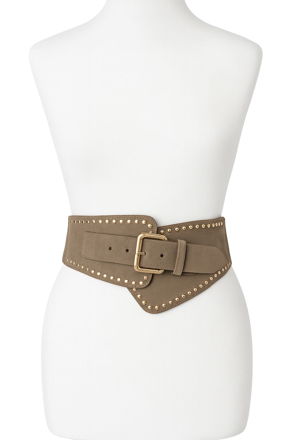 REF: 38888 – Bonito y elegante fajín o cinturón ancho elástico. Se trata de un cinturón de antelina en color beige decorado con tachuelas doradas. La parte trasera presenta goma elástica del mismo tono.