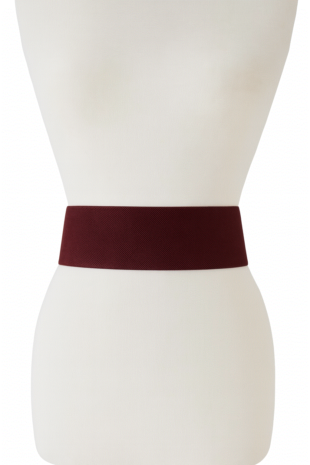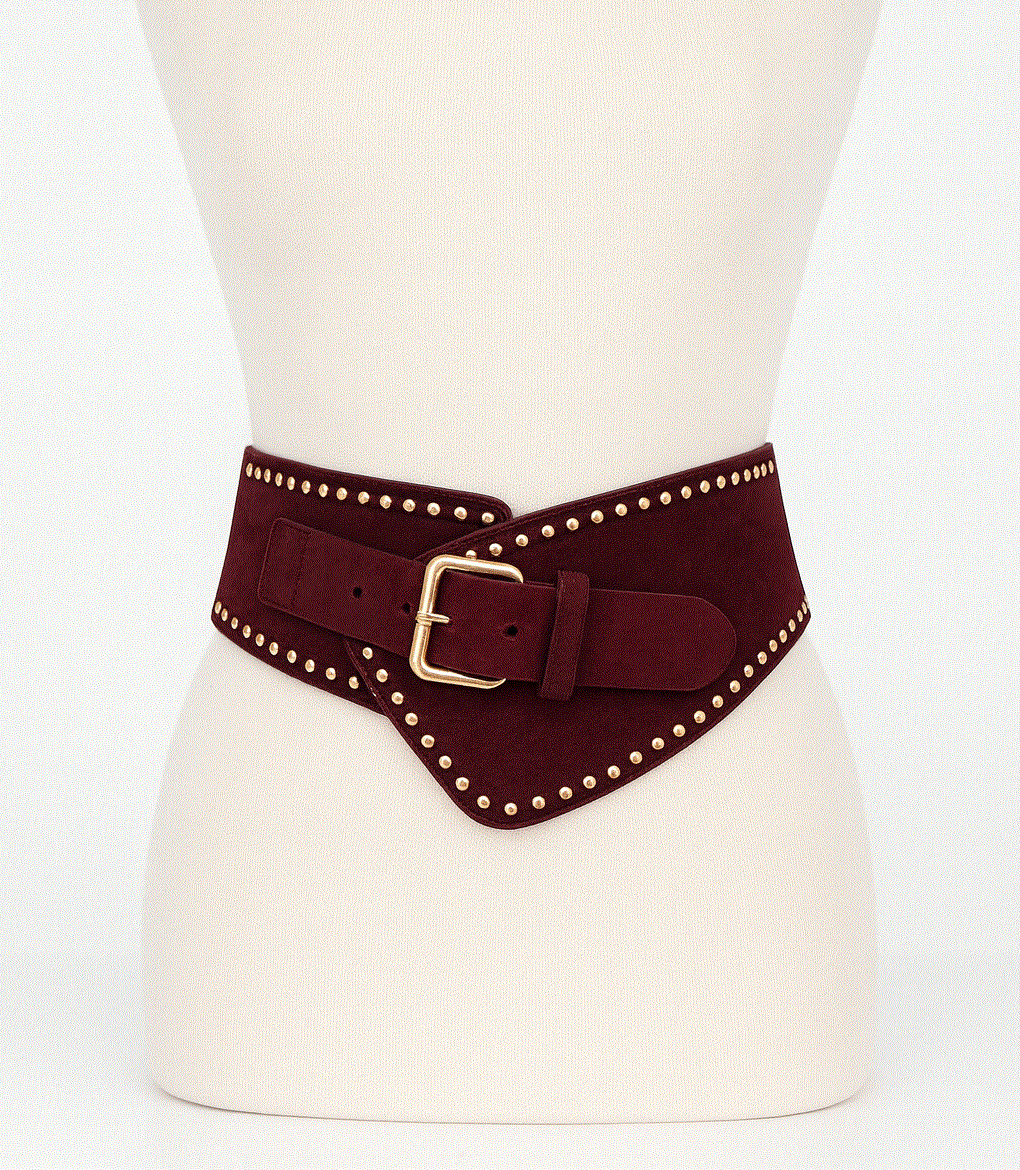 REF: 38888 – Bonito y elegante fajín o cinturón ancho elástico. Se trata de un cinturón de antelina en color burdeos decorado con tachuelas doradas. La parte trasera presenta goma elástica del mismo tono.