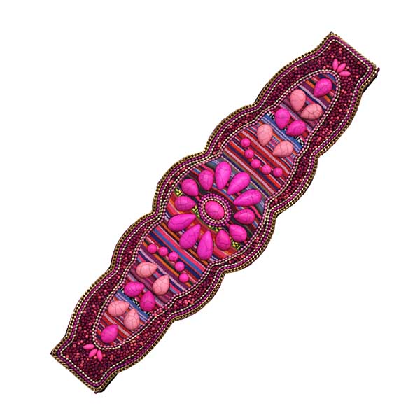 REF: 78856 – Precioso cinturón elástico o fajín fucsia. Está realizado cuidadosamente con cuentas y piedras en tonos fucsia, rosa y detalles morados, su diseño resalta por la combinación de formas florales y geométricas que lo hacen de diseño único y original.