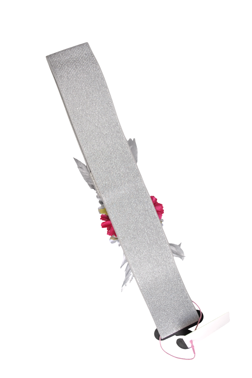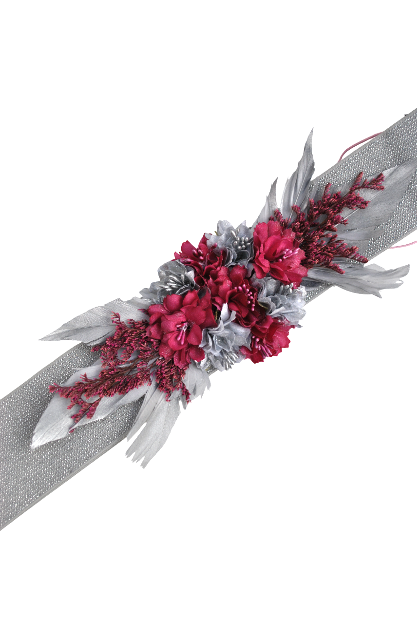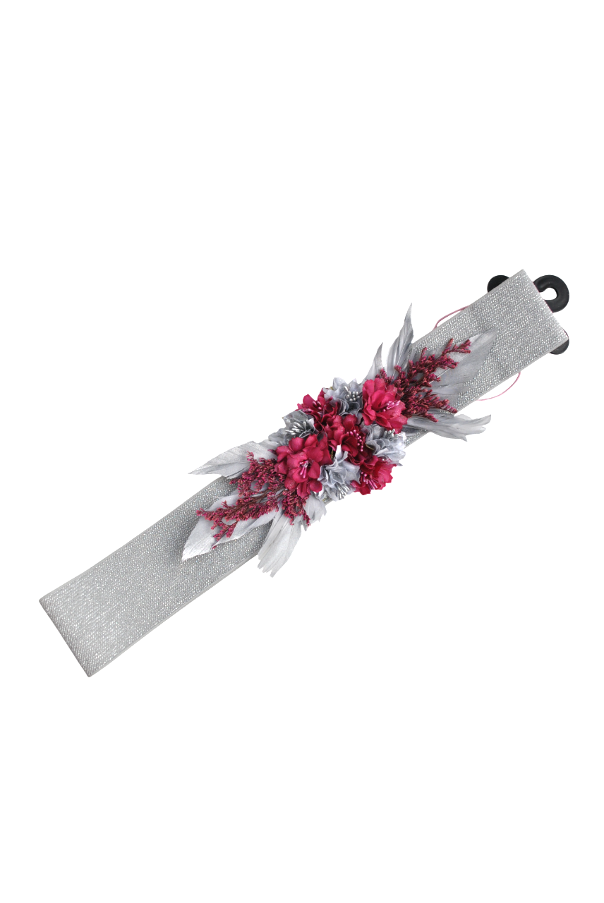 REF: 6012 – Cinturón elástico de fiesta en tono plateado con un acabado ligeramente brillante que aporta elegancia y un ajuste cómodo a cualquier figura. En el centro destaca un adorno floral artesanal, compuesto por flores en tonos fucsia intenso y gris perla, combinadas con pequeñas ramitas decorativas y pétalos suaves que crean un volumen equilibrado y muy favorecedor.