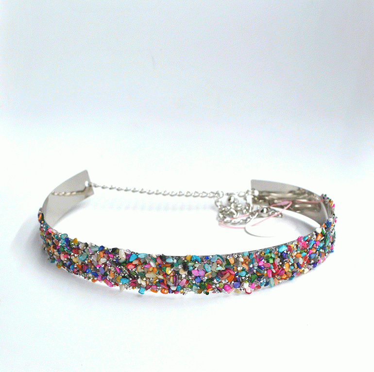 R03/5395 – Bonito y original cinturón de fiesta plateado, perfecto para que luzcas como la invitada ideal. Se trata de un cinturón plateado de metal ligero, decorado con piedras multicolor en la parte delantera.