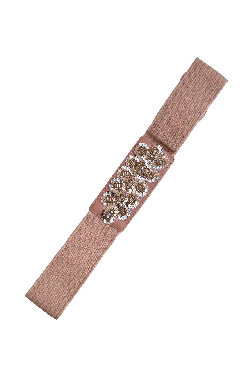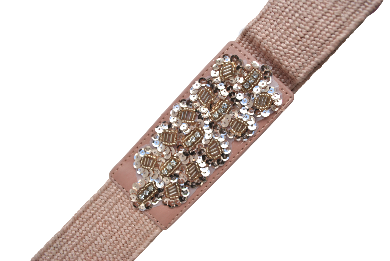 REF: 7526013 – Cinturón elástico en tono rosa nude, un básico imprescindible para invitadas que buscan un complemento discreto pero con un toque de brillo. En la parte frontal incorpora una pieza decorativa realizada con abalorios, cuentas doradas y lentejuelas iridiscentes, creando un diseño luminoso y muy favorecedor que aporta sofisticación sin recargar el look.