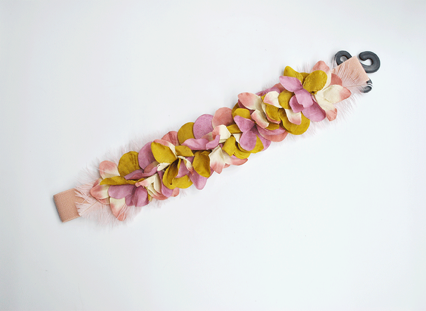 R03/5433 – Precioso fajin o cinturón de fiesta elástico. Se trata de un cinturón de goma elástica en color rosa nude decorado con flores combinadas en color rosa nude y mostaza. Además cuenta con vaporosas plumas también en color rosa.