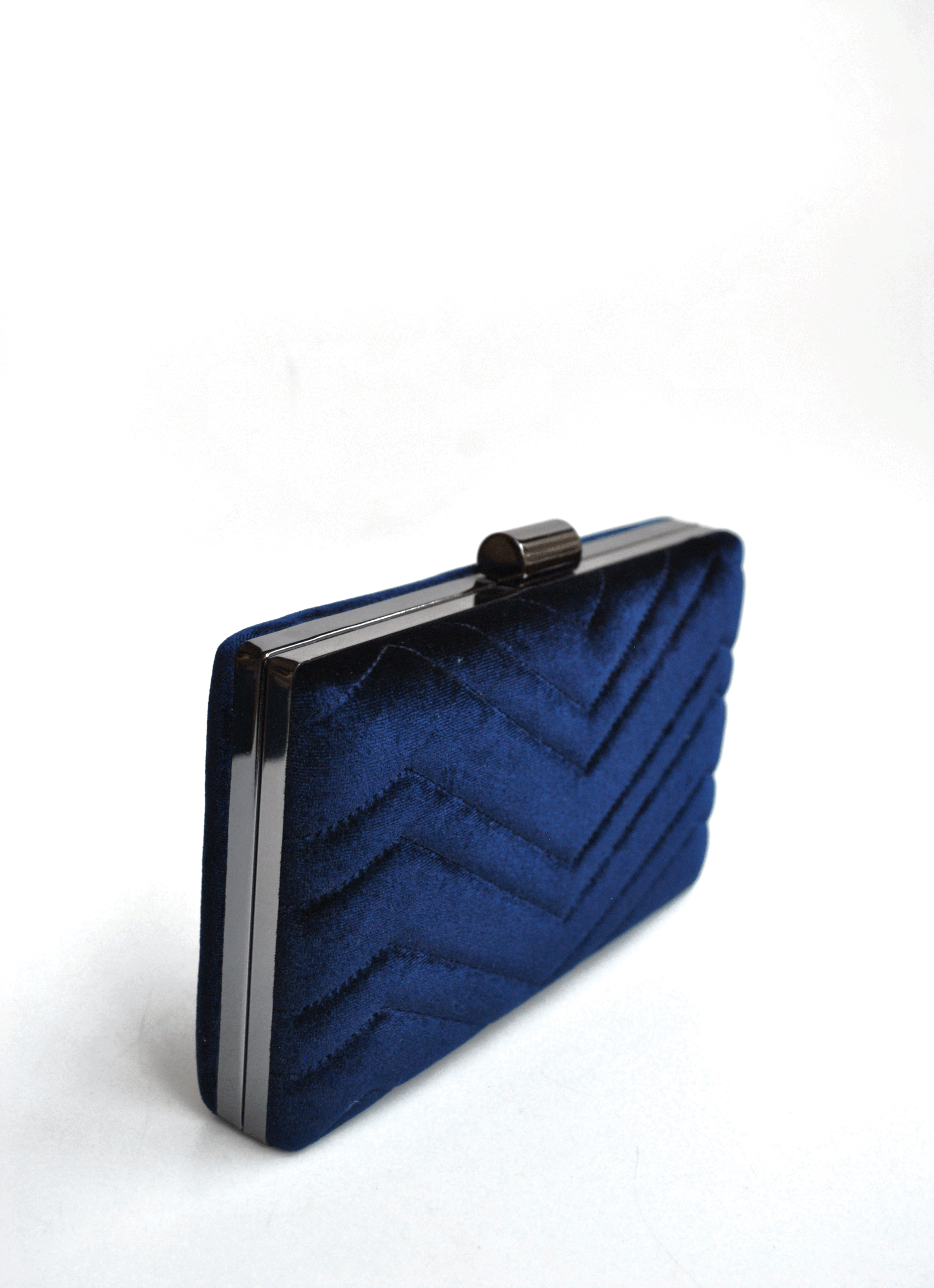 REF: 5833 – Precioso bolso de fiesta clutch azul marino. Se trata de un bolso con diseño rectangular, forrado en tela de terciopelo color azul marino y con detalle de costuras bordadas. Presenta la montura, el broche y la cadena en metal plateado envejecido.