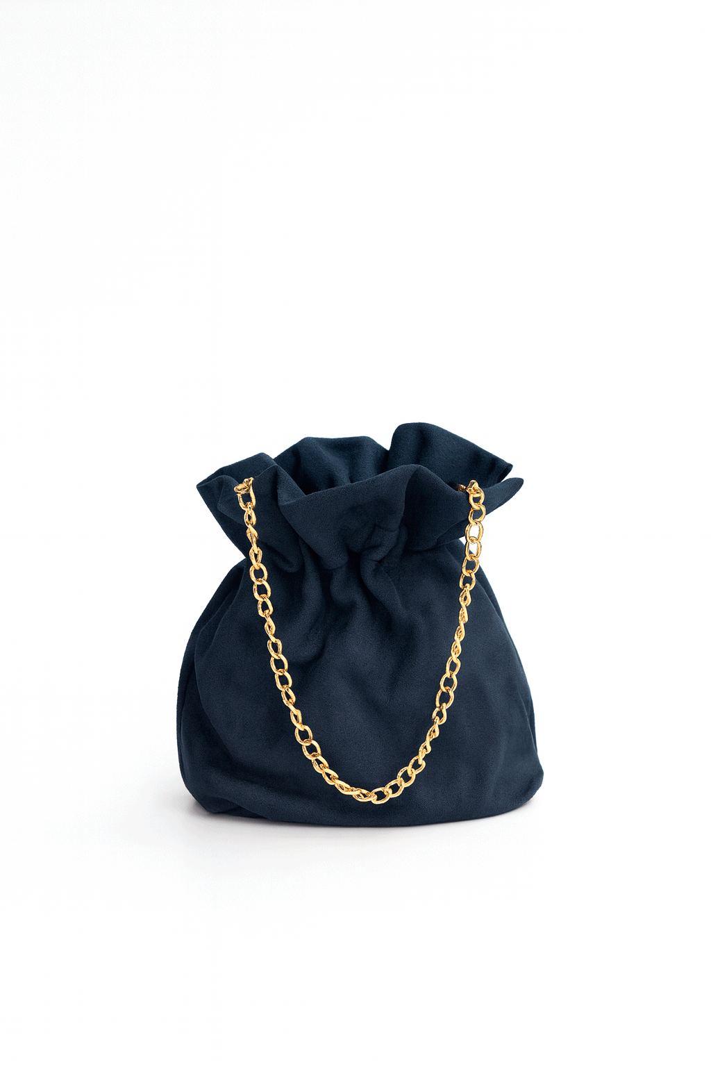 REF: 21415 – Original bolso de fiesta o clutch color azul marino, color súper tendencia esta temporada. Se trata de un bolso diseñado en forma de saco tipo bombonera, confeccionado en una agradable tela de antelina color azul marino. Presenta una cadena métalicada dorada corta para llevarlo como bolso de mano y, también, se incluye una cadena larga también dorada para llevarlo colgado al hombro.