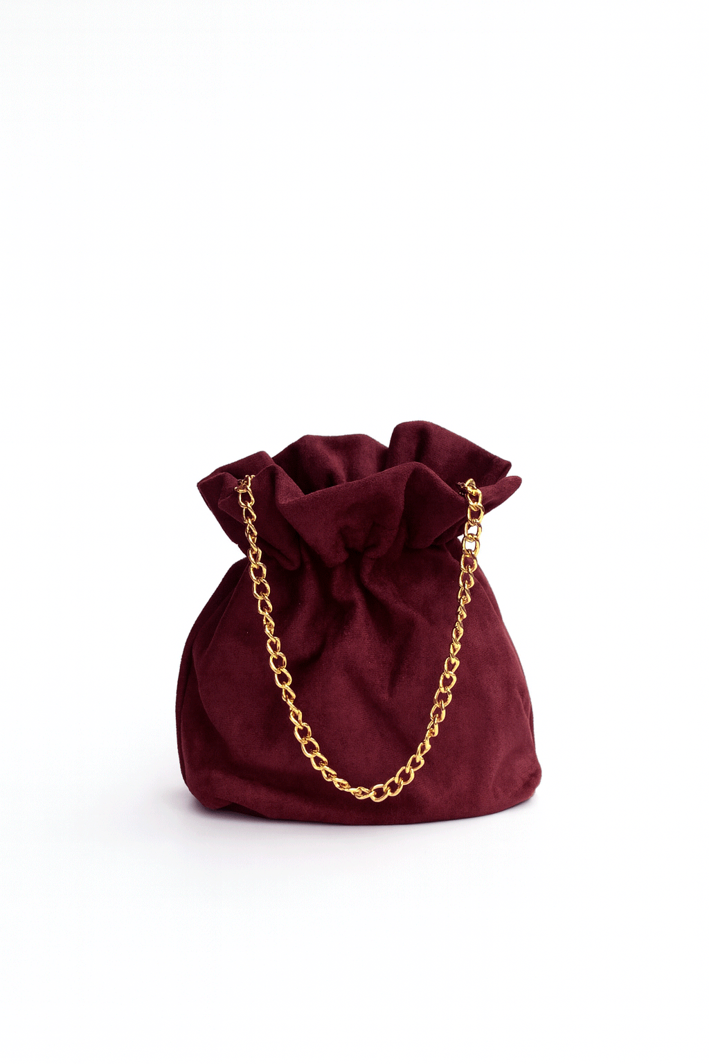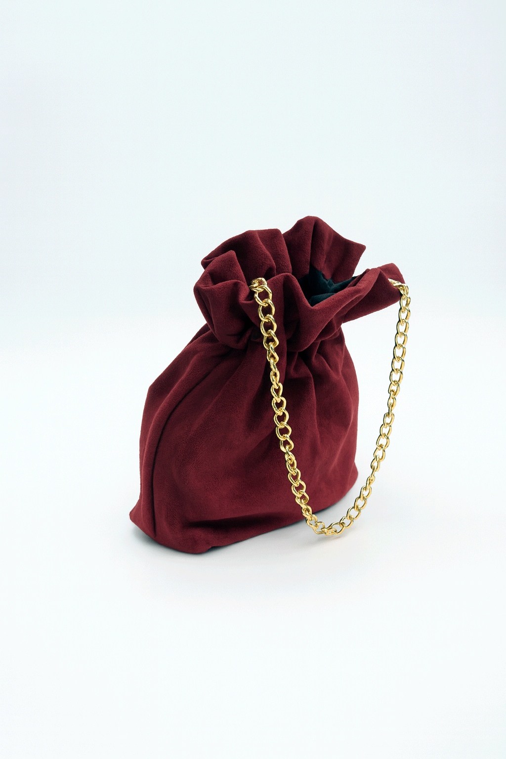 REF: 21415 – Original bolso de fiesta o clutch color burdeos o granate. Se trata de un bolso diseñado en forma de saco tipo bombonera, confeccionado en una agradable tela de antelina color burdeos. Presenta una cadena métalicada dorada corta para llevarlo como bolso de mano y, también, se incluye una cadena larga también dorada para llevarlo colgado al hombro.