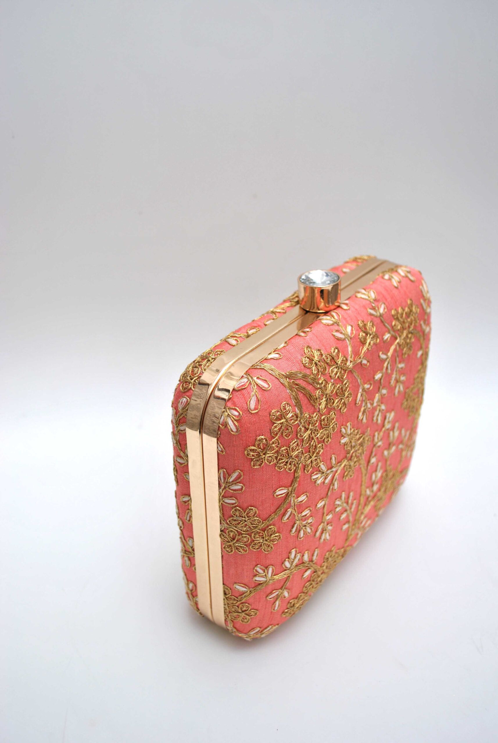 TBC 01526005 – Maravilloso bolso de fiesta clutch color coral. Se trata de un bolso cuadrado forrado en tela de color coral con bordados dorados. Presenta un original broche con un cristal blanco y consta de cadena larga en dorado ideal para llevarlo más cómodamente colgado.