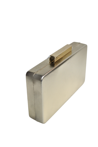R04/5667 – Precioso bolso de fiesta clutch dorado. Se trata de un bolso diseñado en forma de cajita y fabricado en polipiel dorado claro efecto espejo. Presenta un elegante broche dorado rectangular y, además, incluye cadena dorada para llevarlo colgado.