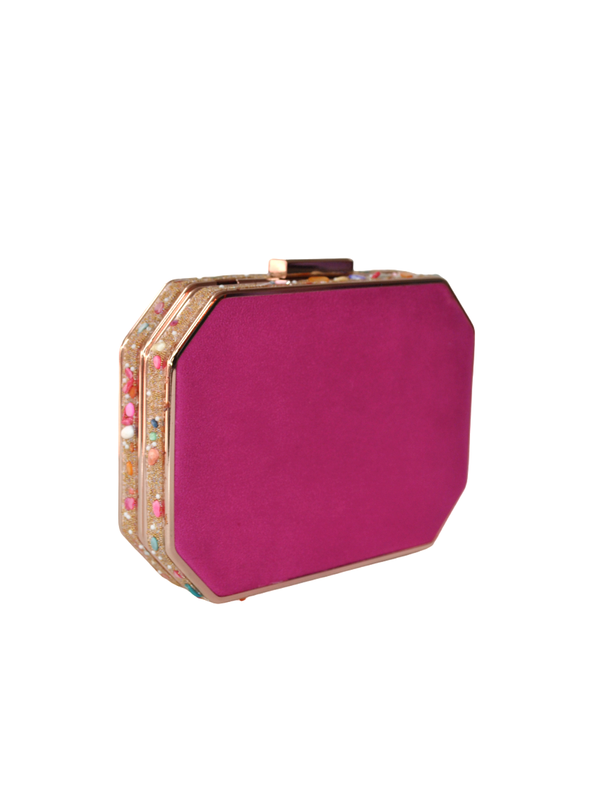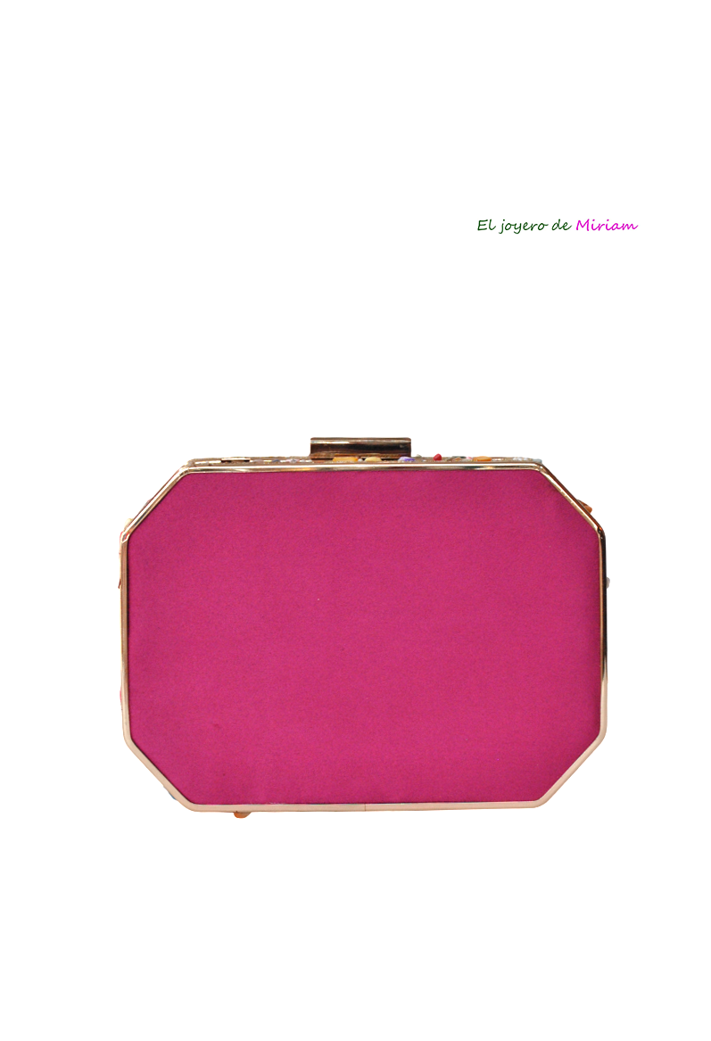 R02/4723 -Original cartera o bolso clutch de fiesta fabricado en antelina de color FUCSIA. Presenta una bonita forma octagonal con metal dorado y decoraciones a base de pequeñas piedras multicolor. El interior consta de una cadena dorada para llevarlo más cómodamente colgado.