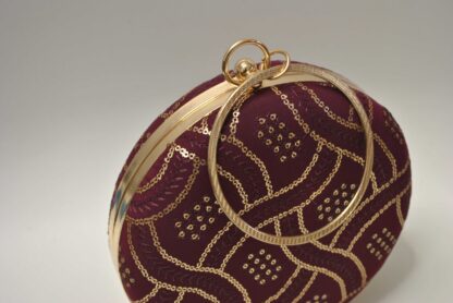 TBC01526007 – Original y estiloso bolso de fiesta GRANATE – BURDEOS forrado en tela granate y con asa de metal en dorado y pequeños brillantes blancos. Presenta bordados granates con elegantes lentejuelas doradas. Este modelo es ideal, tiene esta forma redondeada tan original con el que podrás dar el toque que buscas para tu vestido de fiesta o noche en bodas, comuniones, bautizos y otras celebraciones, será un estupendo fondo de armario, ultimas tendencias, lleva cadena dorada para colgar.