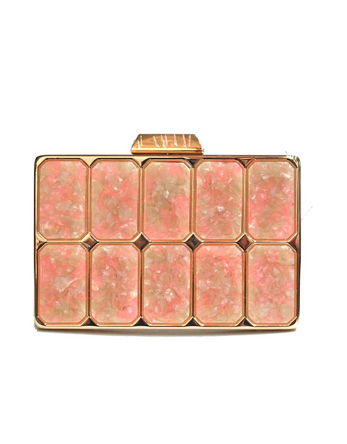 R04/5780 – Precioso bolso de fiesta o bolso clutch rosa nude y beige, fabricado en metal ligero dorado y decorado con incrustaciones de carey sintético en tonos rosas con beiges y, diseñado en una original forma de cajita. Sin duda, un bolso elegante y con diseño debido a sus líneas rectas, un bolso ideal para bodas o para la noche. Dispone de cadena dorada para colgar.