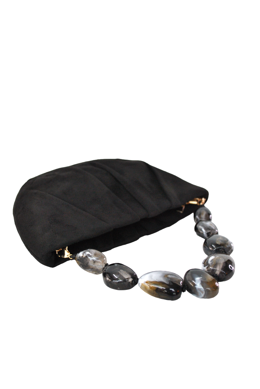 RDV0911245873 – Bonito y original bolso de fiesta o clutch negro. Se trata de un bolso fabricado en antelina de color negro diseñado de forma ovalada y con un original asa decorada con piedras de resina, perfecto para llevarlo como bolso de mano. Además, en el interior se incluye una cadena larga en dorado para llevarlo más cómodamente colgado.