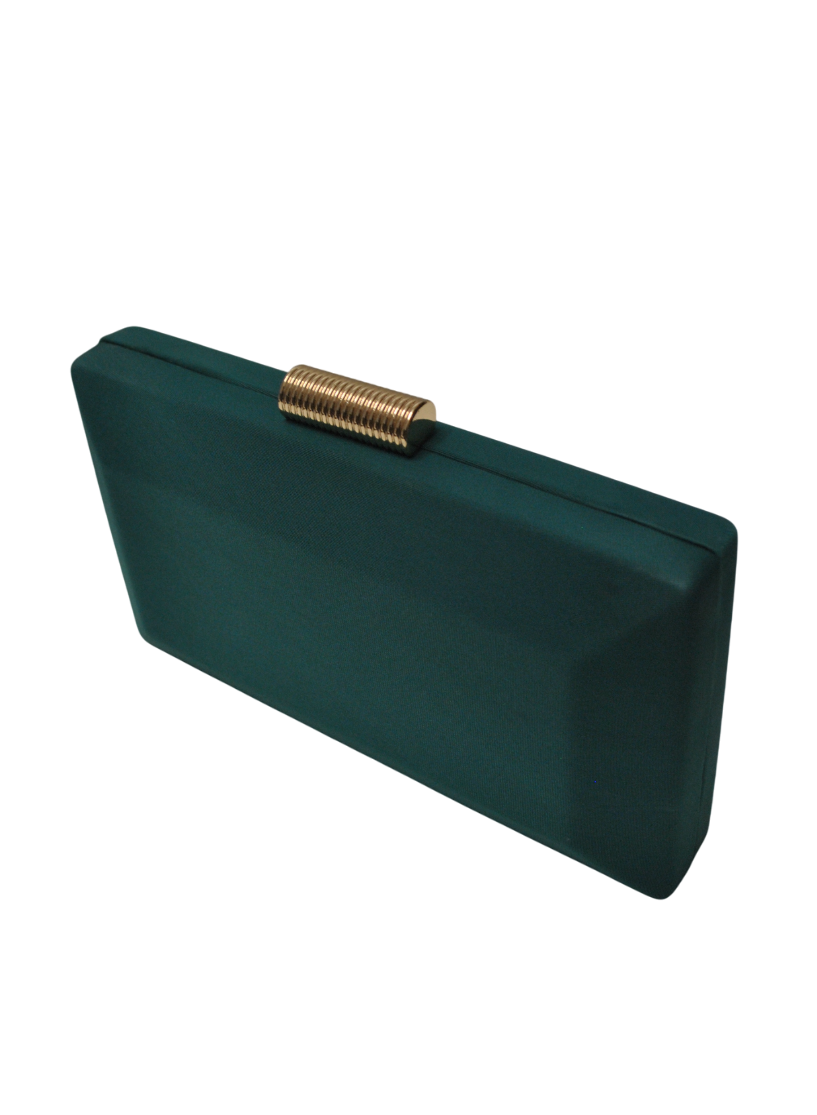R04/5763 – Elegante bolso de fiesta clutch verde botella de raso. Se trata de un bolso rectangular forrado en tela brillante de color botella y con el broche en dorado. En el interior se incluye una cadena larga dorada para llevarlo cómodamente colgado.