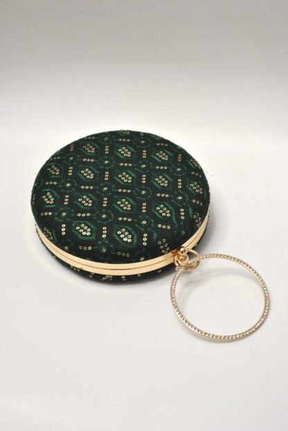 TBC01526007 – Original y estiloso bolso de fiesta verde botella forrado en tela verde y con asa de metal en dorado y pequeños brillantes blancos. Presenta bordados verdes con elegantes lentejuelas doradas. Este modelo es ideal, tiene esta forma redondeada tan original con el que podrás dar el toque que buscas para tu vestido de fiesta o noche en bodas, comuniones, bautizos y otras celebraciones, será un estupendo fondo de armario, ultimas tendencias, lleva cadena dorada para colgar.