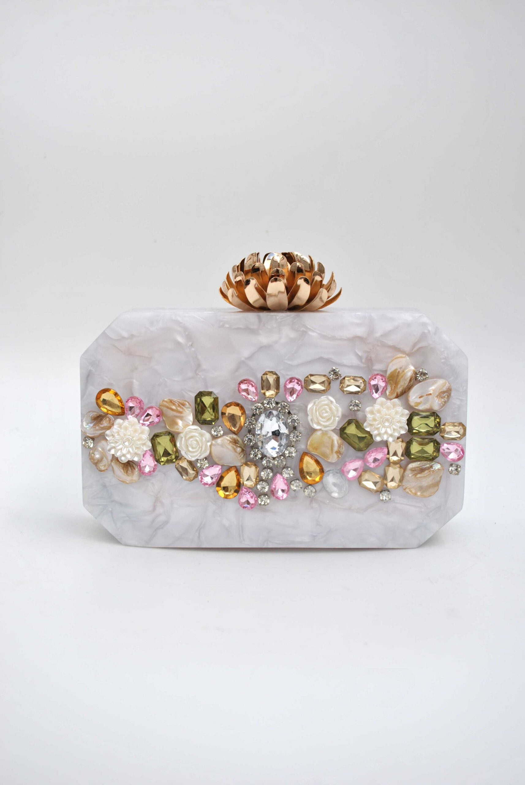 REF: TBC01526003 – Elegante clutch de resina marmoleada en tono blanco perlado, embellecido con un diseño frontal de pedrería multicolor en tonos rosa, ámbar, verde olivo y cristal, además de delicadas flores en relieve. La pieza central es un broche en forma de flor dorada metálica que actúa como cierre, aportando un toque sofisticado y artístico. Ideal para eventos formales, bodas o noches especiales, este bolso combina lujo artesanal con diseño moderno.