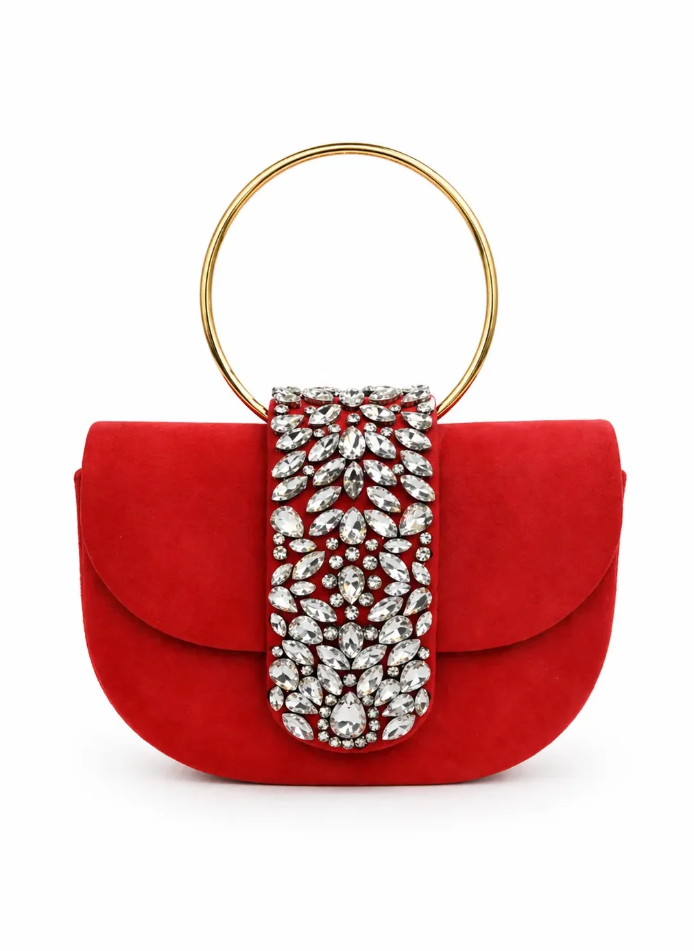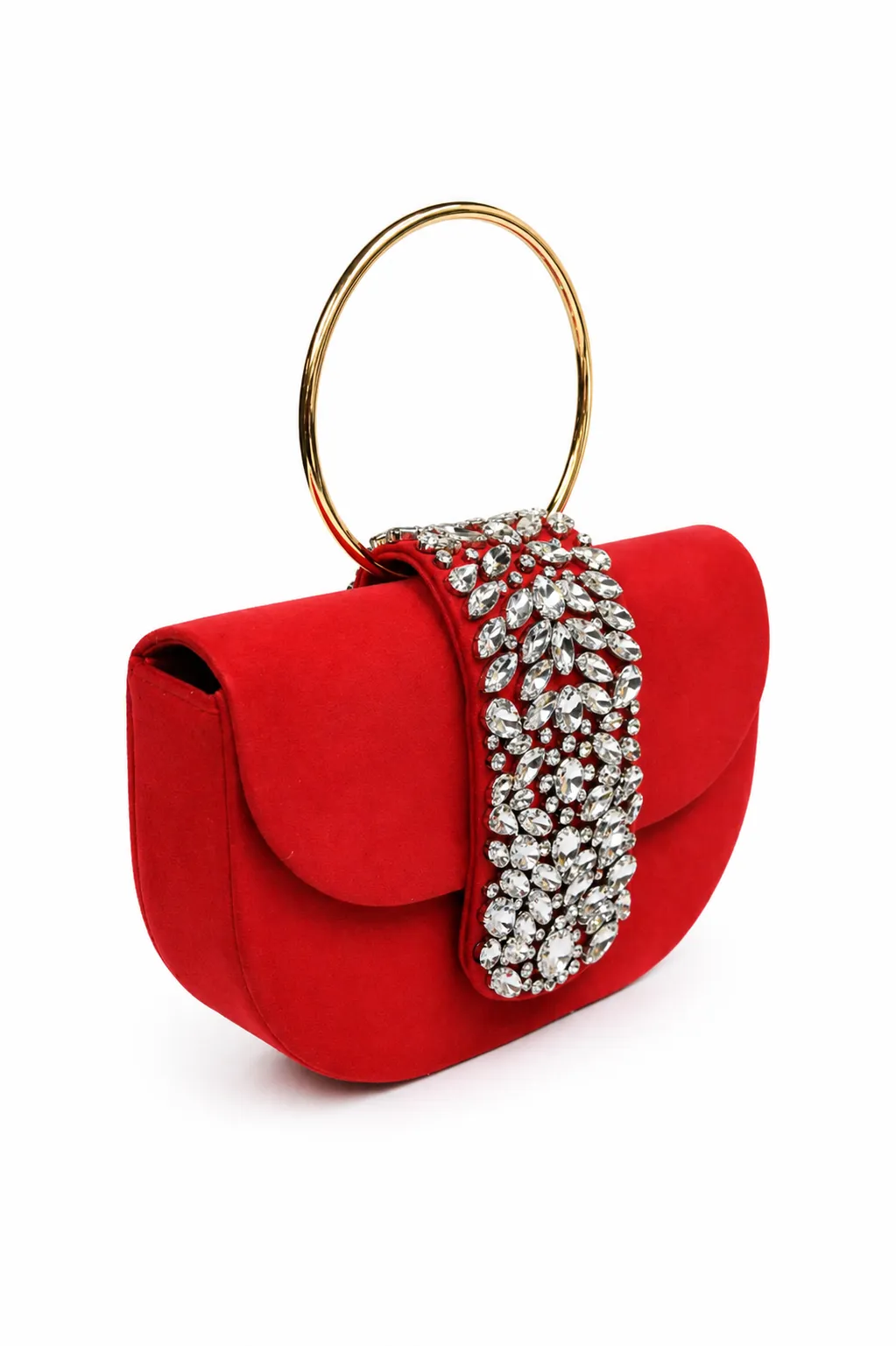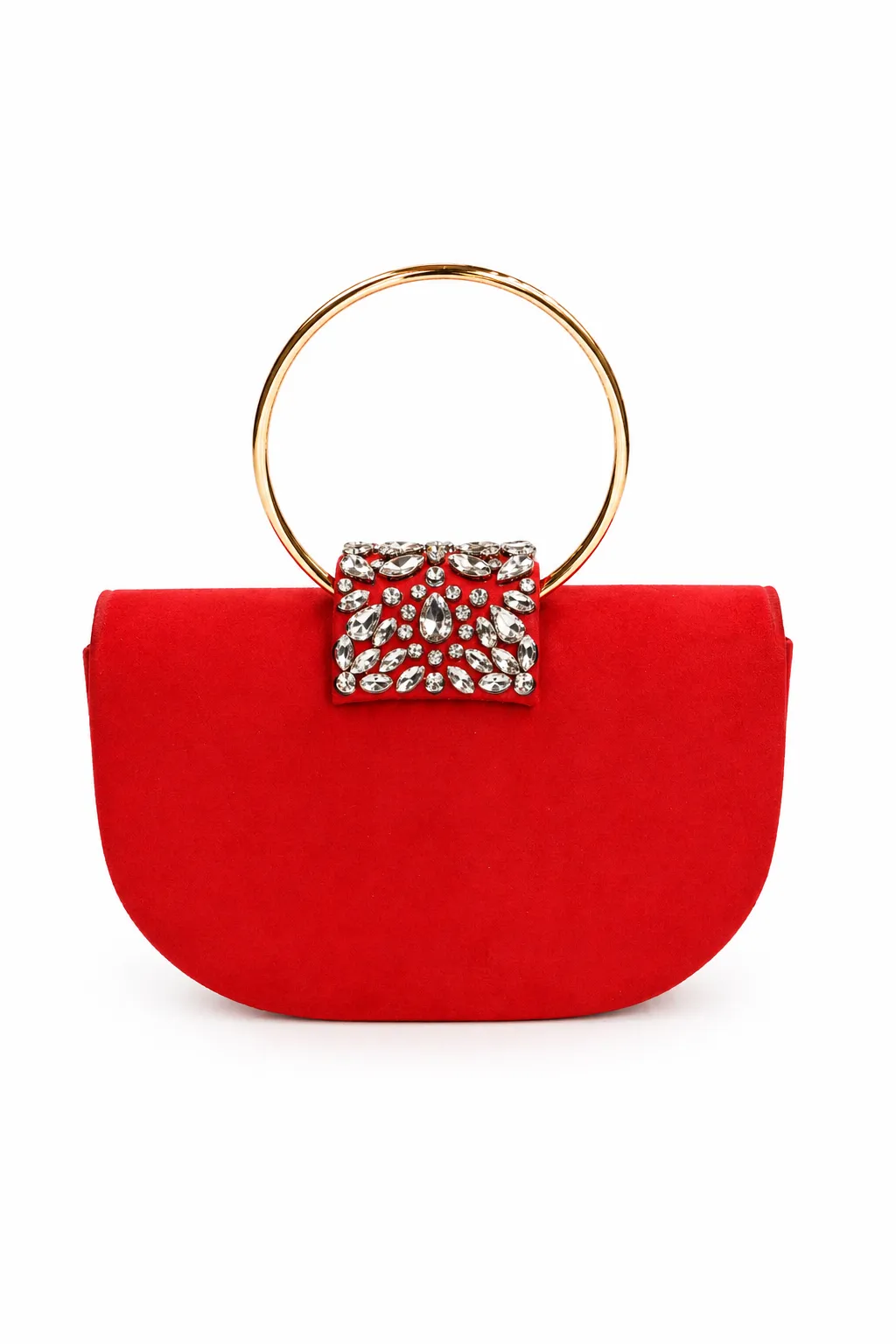 REF: KC-901922 – Precioso bolso de fiesta clutch rojo con asa. Se trata de un bolso ligeramente ovalado forrado en tela de antelina. Destaca una pequeña solapa con detalles en pedrería blanca además de un asa redondo para llevarlo como bolso de mano. Además, incluye cadena larga en el interior para llevarlo más cómodamente colgado.