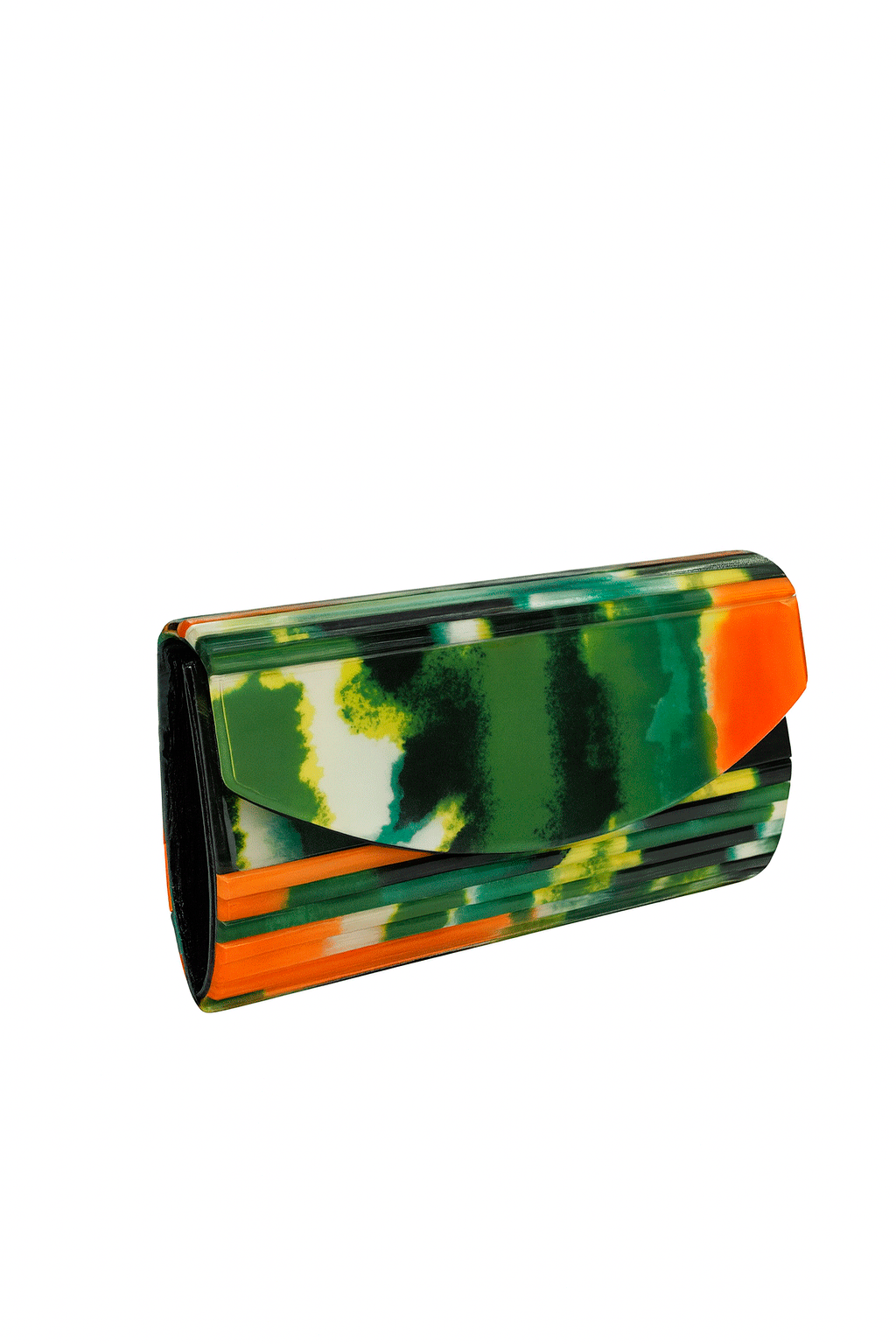 REF: VV-5252 – Precioso y original bolso de fiesta multicolor. Se trata de un bolso rectangular con persiana en la parte delantera y, fabricado en carey sintético  combinado en tonos verdes y alguno que otro naranja. Lo puedes llevar cómodamente colgado gracias a la cadena larga en dorado que incluye en el interior.