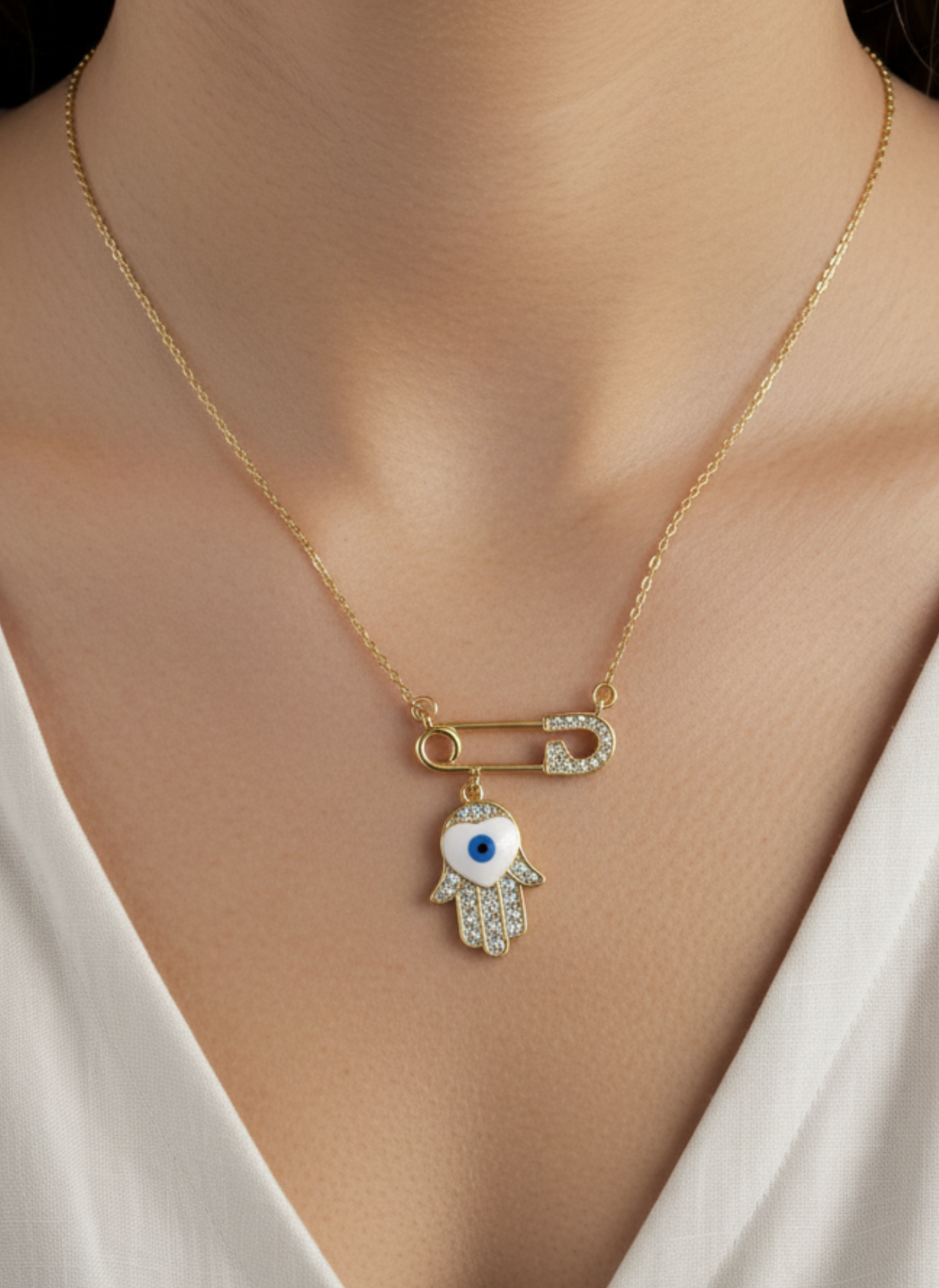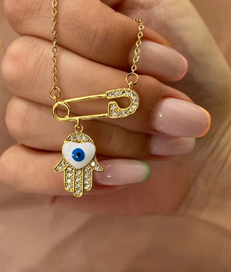 REF: 74497 – Colgante en acero inoxidable dorado con diseño moderno y protector. La pieza combina un imperdible decorado con circonitas brillantes y una delicada Mano de Fátima colgante, rematada con un ojo turco esmaltado en azul y blanco. Un accesorio cargado de simbolismo, ideal para atraer buena energía y alejar las malas vibras, sin renunciar al estilo. Su acabado dorado aporta un toque elegante y juvenil, perfecto para uso diario o como regalo especial.