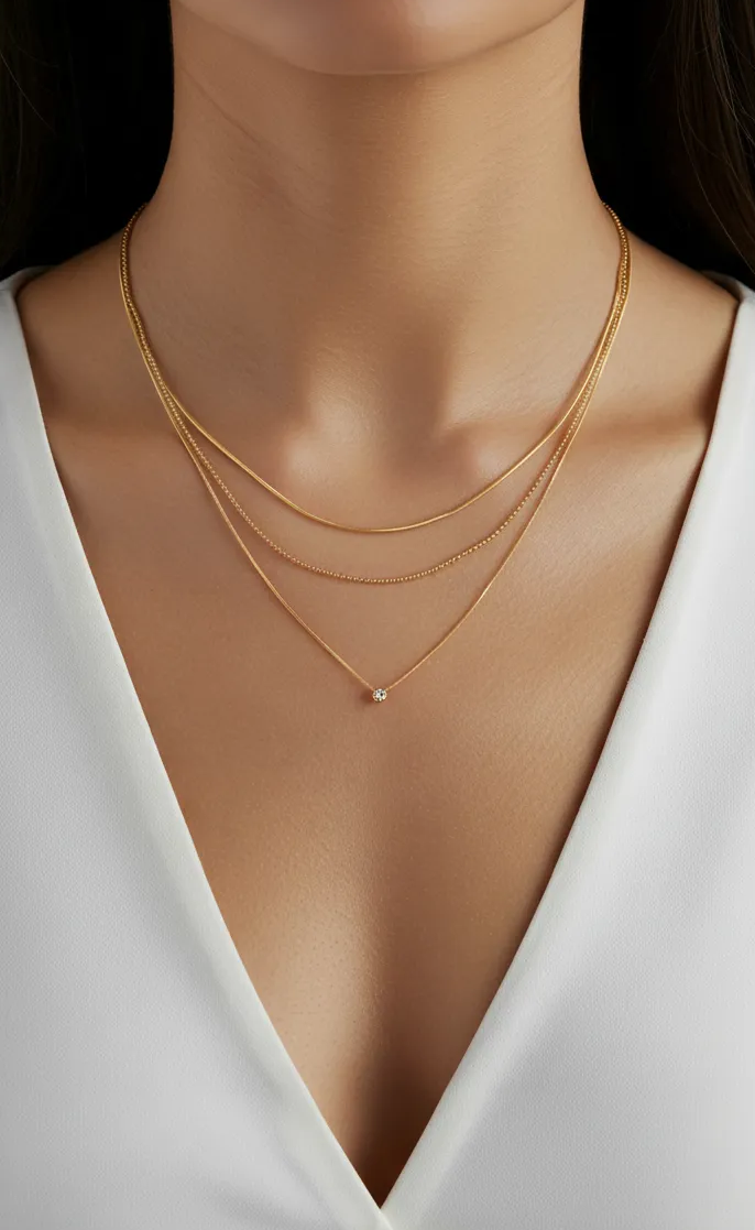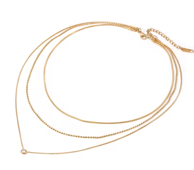 2547456 – Collar dorado de diseño triple capa, formado por tres cadenas finas de diferentes estilos y longitudes que crean un efecto elegante y equilibrado. Incluye una cadena lisa, otra tipo bolitas y una tercera más delicada, rematada con un pequeño detalle brillante que aporta un toque sutil de luz. Cuenta con cierre de mosquetón y cadena extensora, lo que permite ajustar la longitud y adaptarlo cómodamente a distintos escotes.