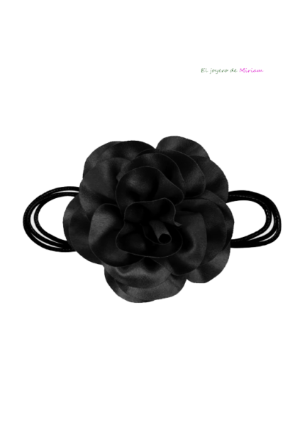 Bonito collar con cordón negro y con la decoración de una flor en tela brillante de color negro. ¡Súper tendencia esta temporada!