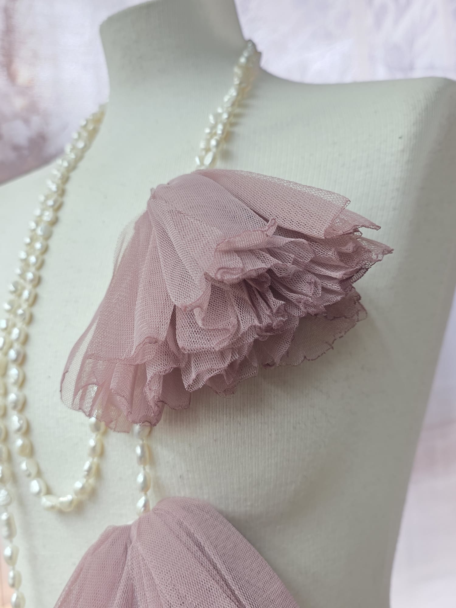 REF: 914706 – Sofisticado collar largo compuesto por perlas de acabado nacarado, dispuestas de forma armoniosa para crear una silueta fluida y elegante. El diseño se realza con dos voluminosas flores de tul en tono rosa nude, ligeras y etéreas, que aportan carácter, textura y un marcado aire femenino.