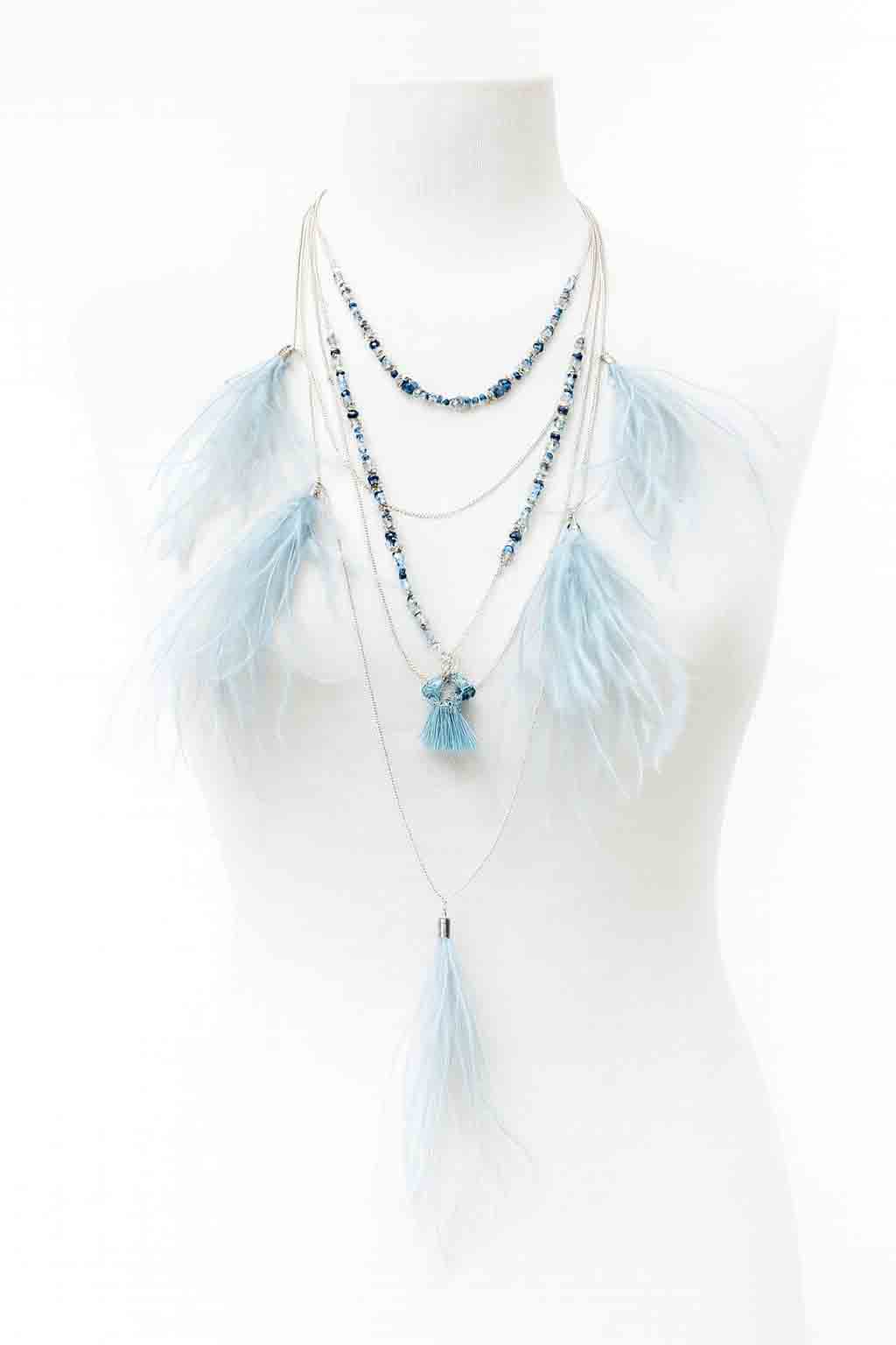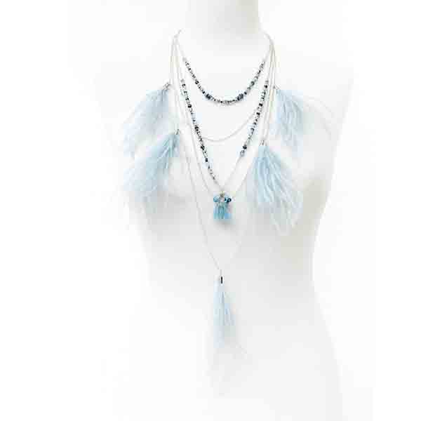 REF: 85563 – Este elegante collar largo en capas combina cuentas en tonos azul marino y celeste con delicados colgantes de plumas y borlas, creando un estilo bohemio sofisticado. Su diseño multifacético incluye cadenas finas y detalles llamativos que aportan movimiento y frescura, ideal para complementar looks casuales o dar un toque chic a un outfit de noche. Ligero y versátil, es el accesorio perfecto para quienes buscan destacar con un estilo único y lleno de personalidad.