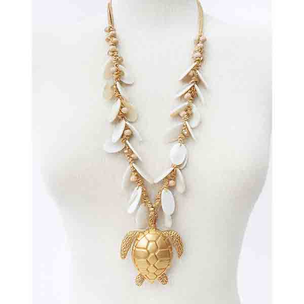 REF: 24810 – Precioso y original collar largo. Se trata de un collar decorado con cuentas sintéticas blancas nacaradas y con detalle central con la figura de una tortuga en color dorado mate.