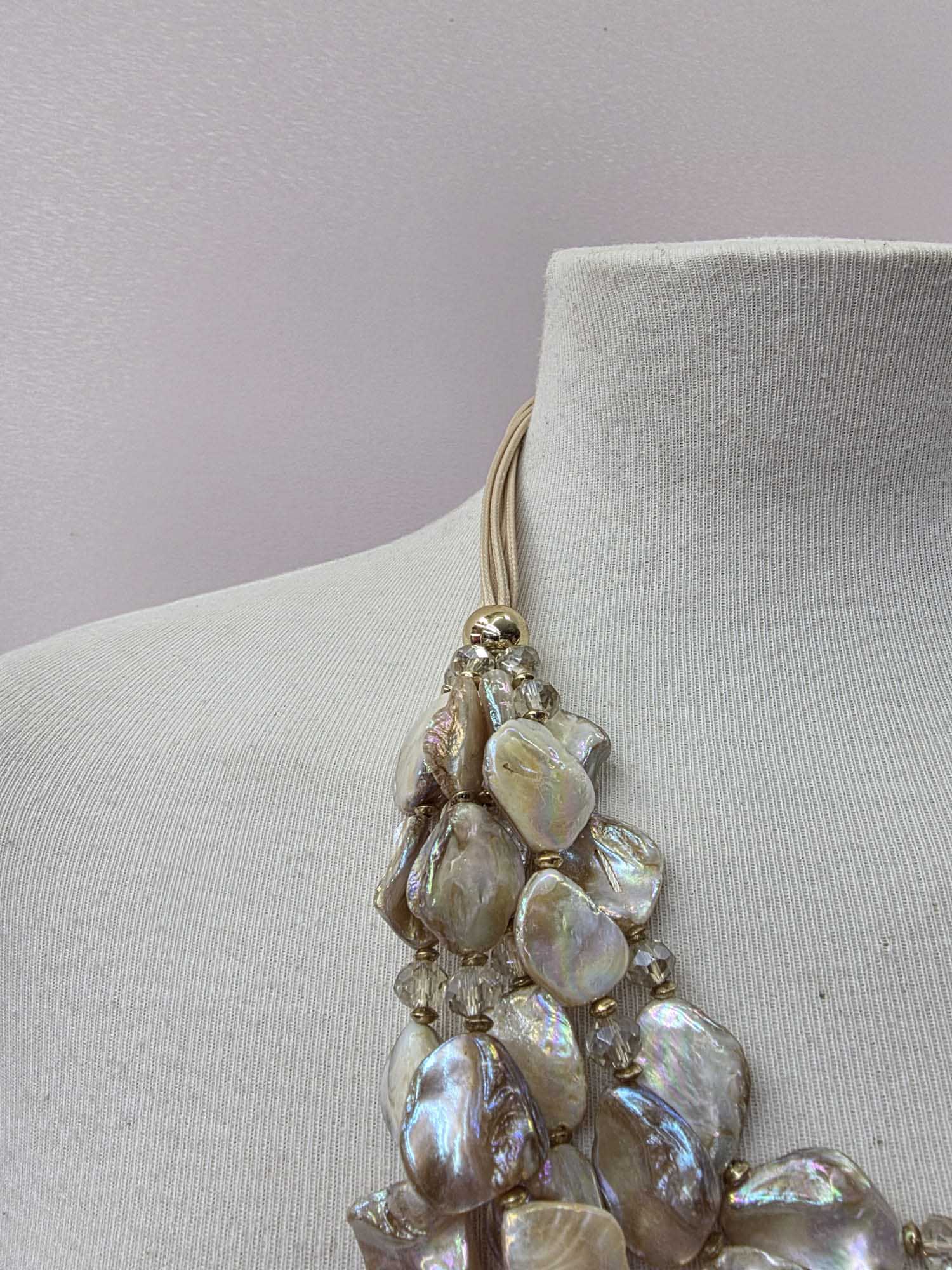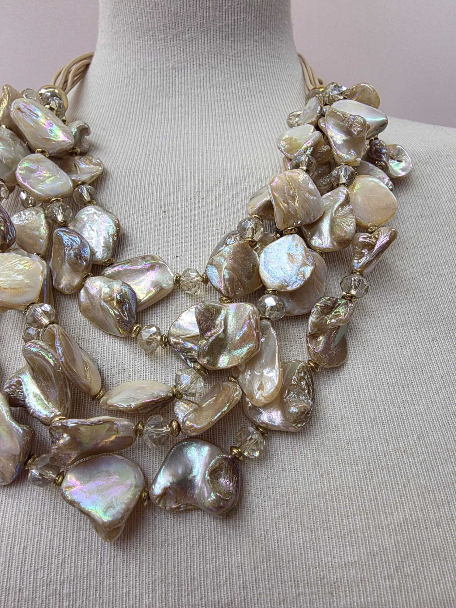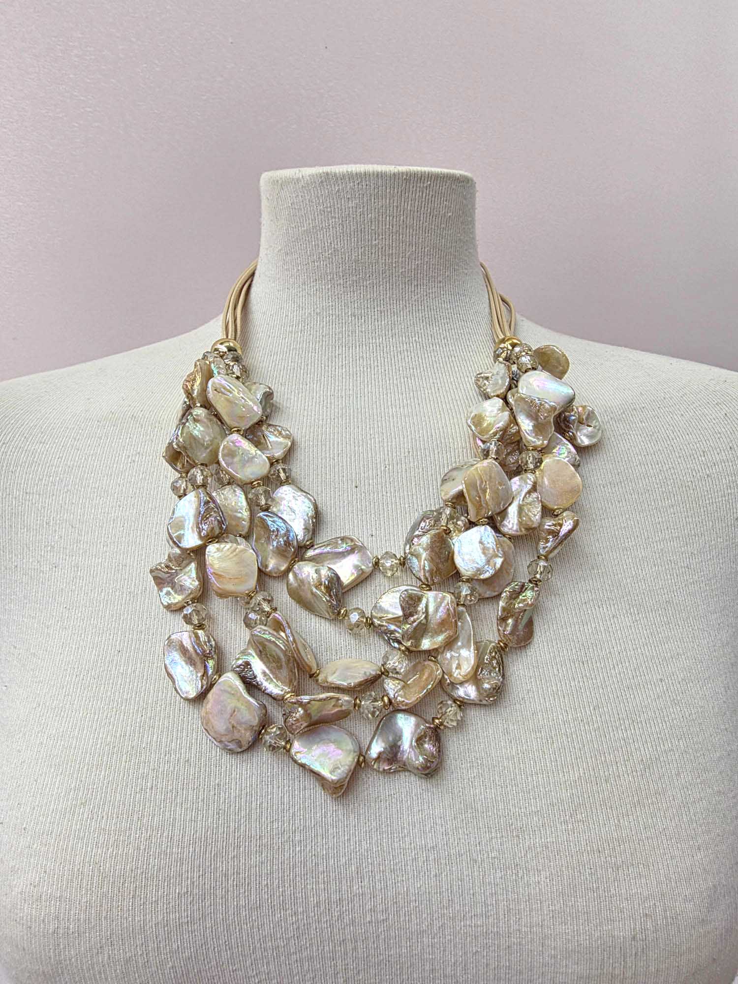 R04/5522 – Bonito y elegante collar corto de mujer. Se trata de un collar múltiple decorado con piedras irregulares de nácar y pequeños cristales transparentes.