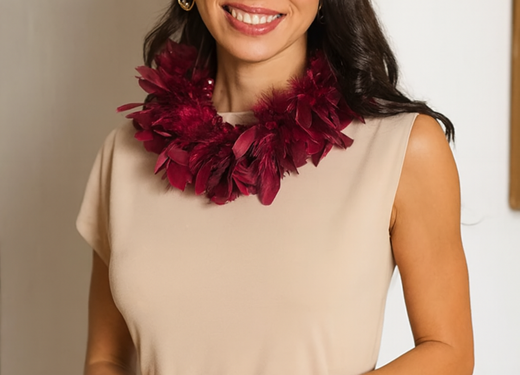 SNT-5362 – Precioso y estiloso collar de plumas. Se trata de un collar corto de color burdeos decorado con suaves y vaporosas plumas burdeos.