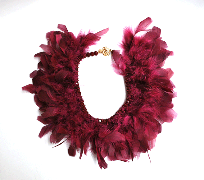 R03/5362 – Precioso y estiloso collar de plumas. Se trata de un collar corto de color burdeos decorado con suaves y vaporosas plumas burdeos.