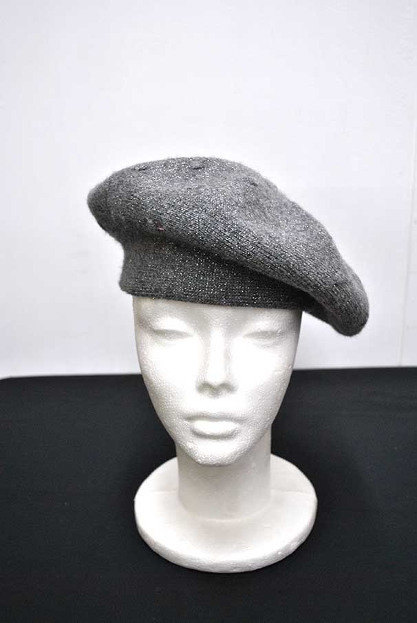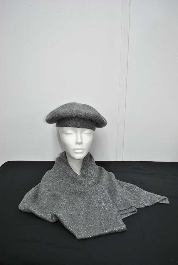 R101/ Bonito conjunto compuesto por una boina y una bufanda a juego. Muy estiloso y confeccionado en tela gris brillante.