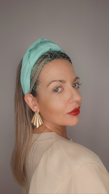 R04/5727 – Bonita diadema aguamarina de fiesta o tocado. Se trata de una diadema forrada en tela con detalle central con un nudo y una elegante redecilla del mismo tono. ¡Queda espectacular!