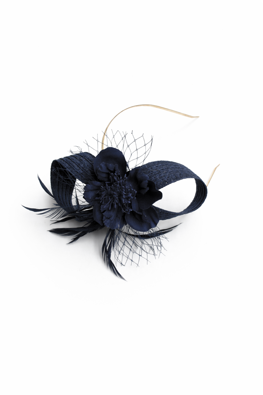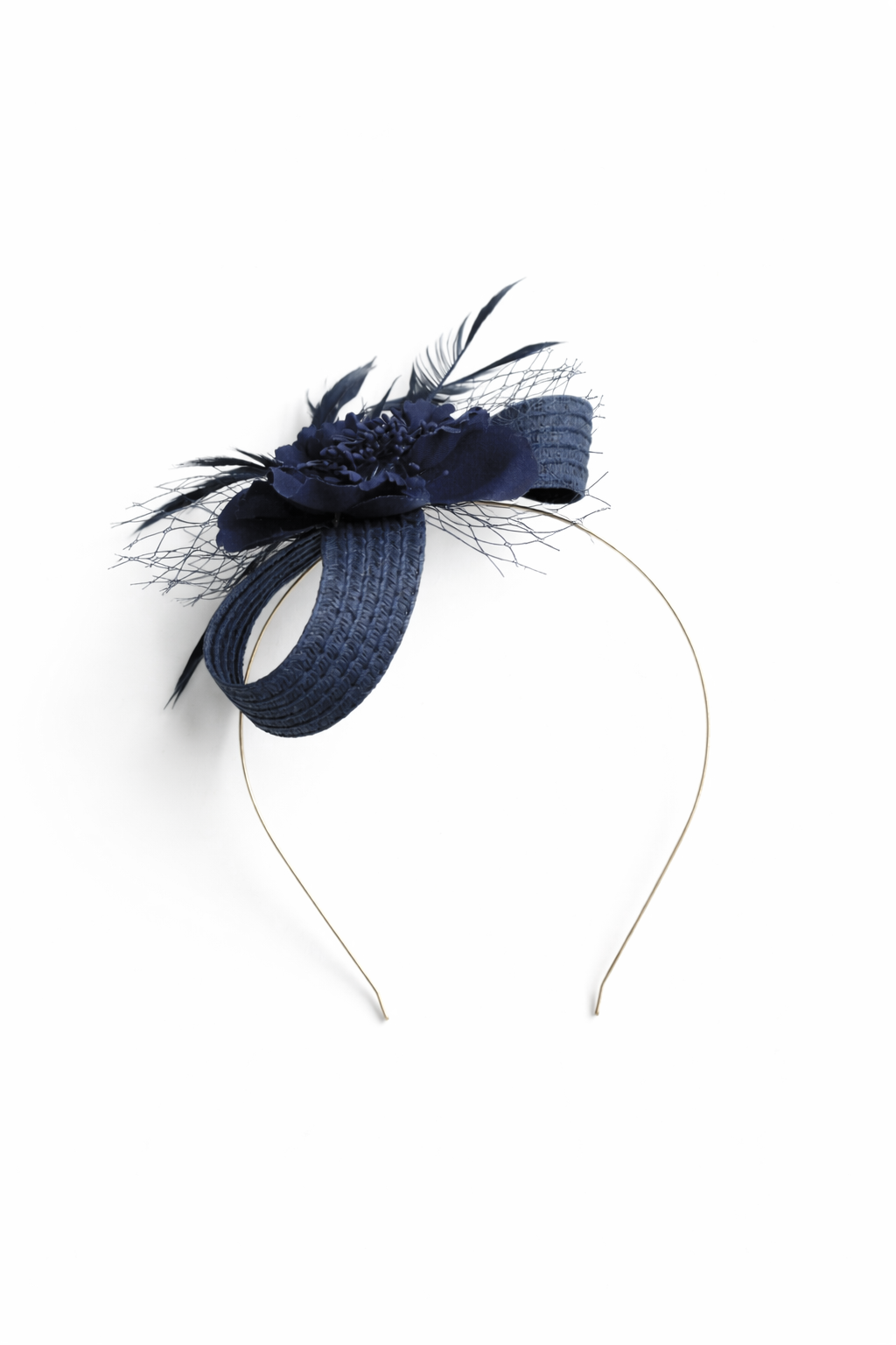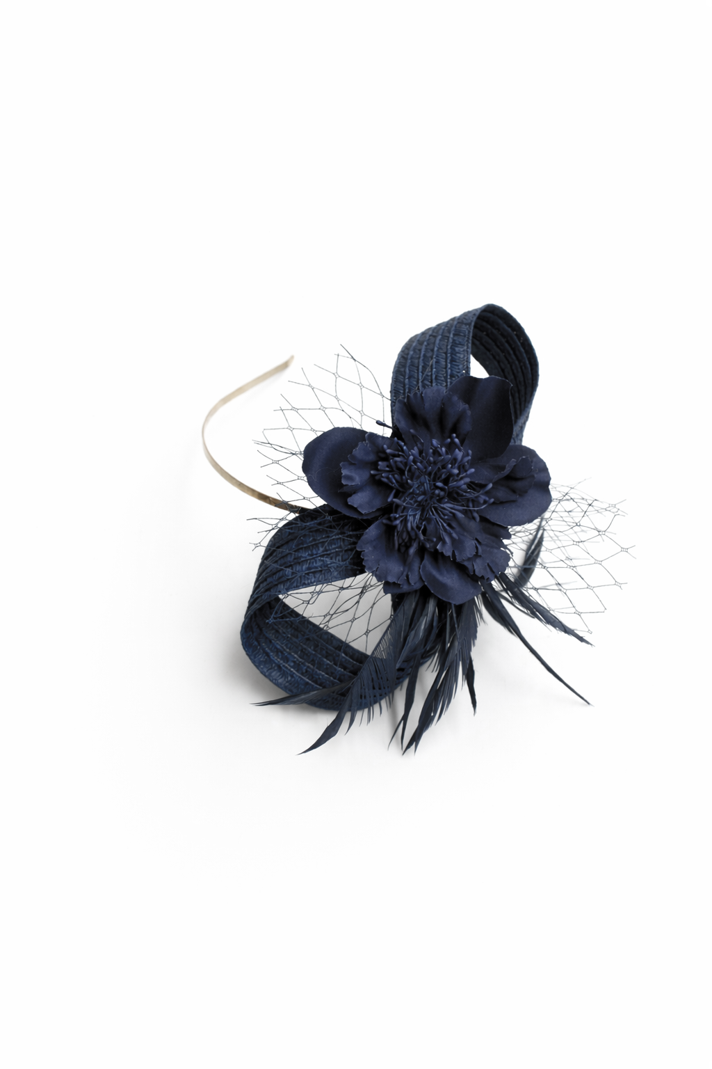REF: 51072 – Elegante tocado en tono azul marino compuesto por base de diadema metálica fina y diseño estructurado con lazadas de rafia, flor central en relieve, delicada rejilla y plumas decorativas. Una pieza sofisticada y muy favorecedora, perfecta para bodas, comuniones, bautizos y eventos especiales.