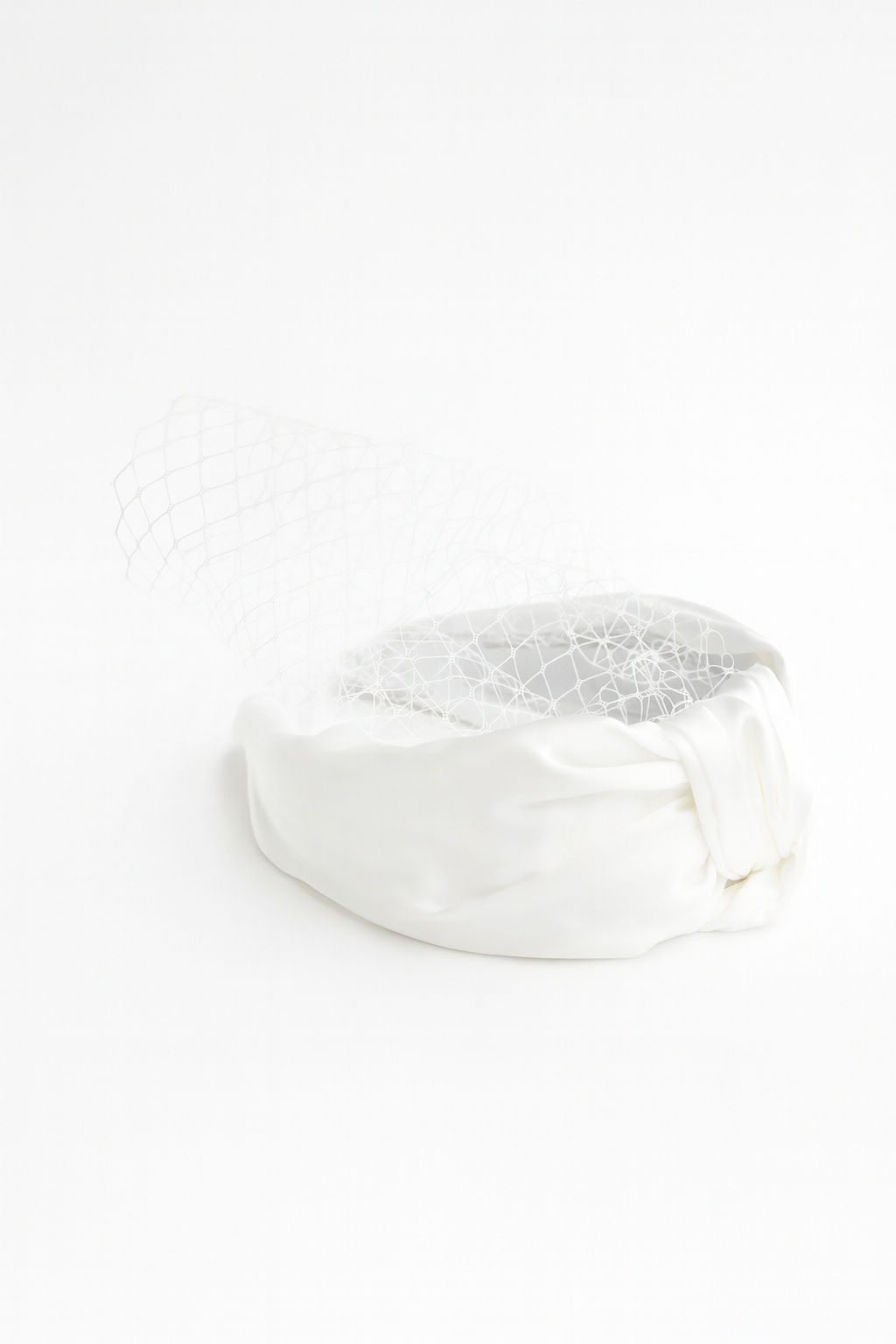 R04/5727 – Bonita diadema de fiesta o tocado blanco. Se trata de una diadema forrada en tela de raso con detalle central fruncido y una elegante redecilla del mismo tono. ¡Queda espectacular!
