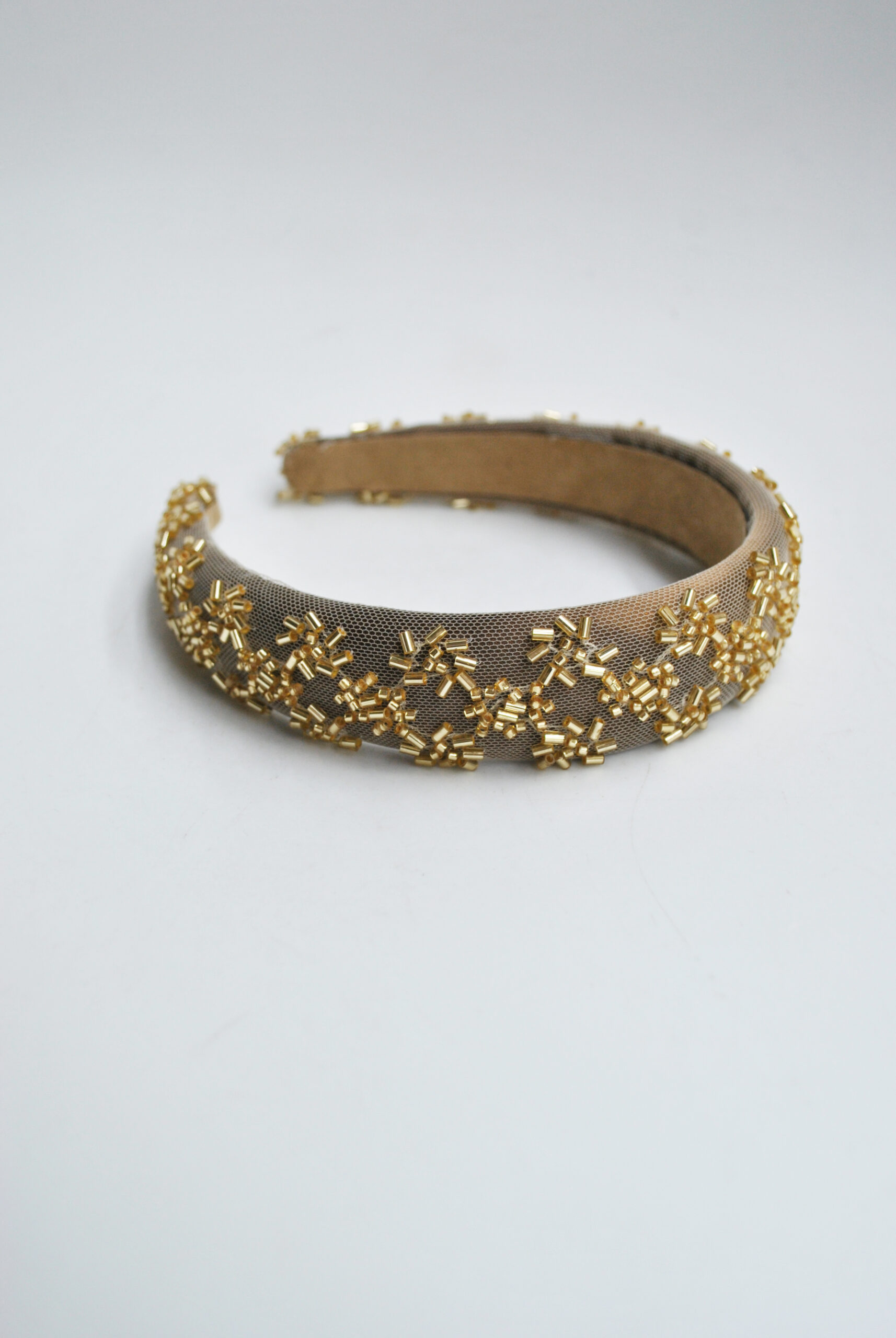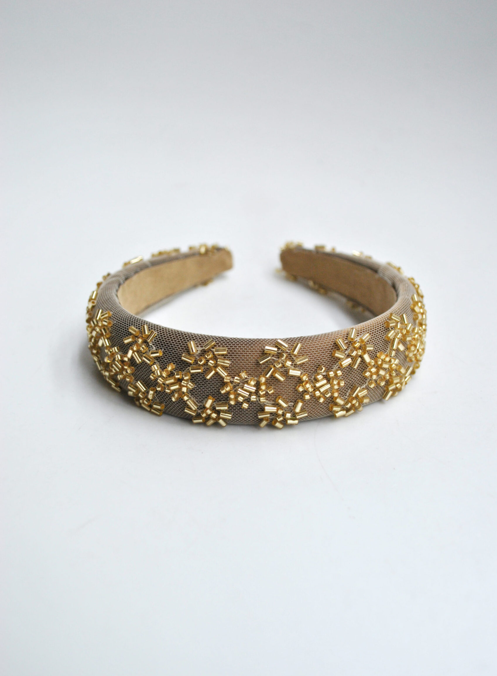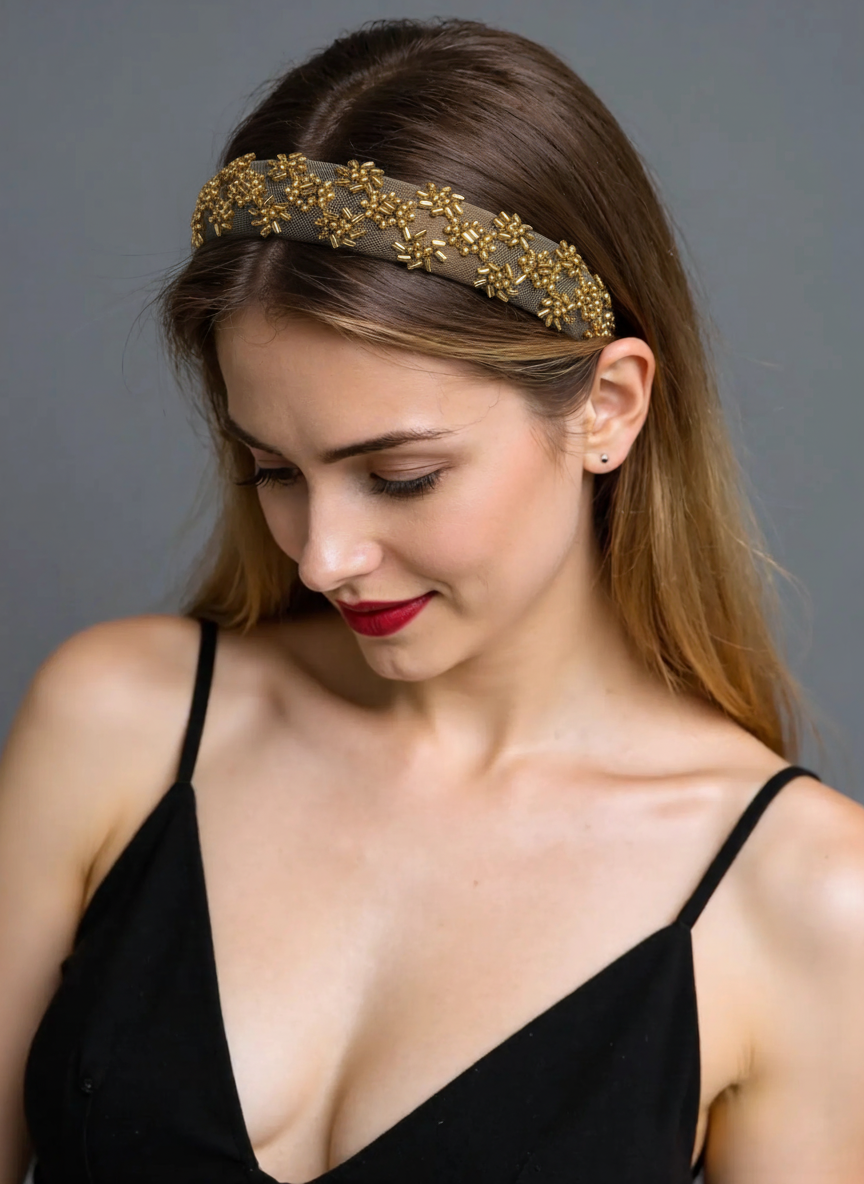 REF: 58550 – Preciosa diadema de fiesta, elegante y sofisticada, elaborada en tejido marrón y decorada con un delicado bordado de cuentas y cilindros metálicos en tono dorado que forman un diseño geométrico de gran brillo.