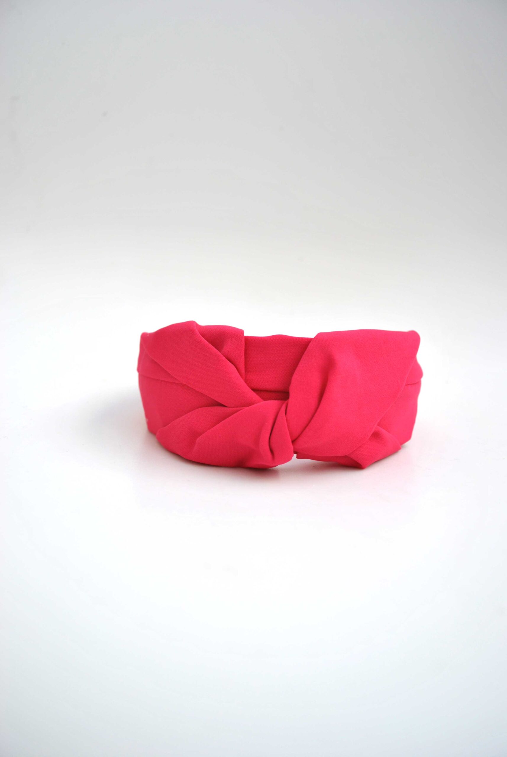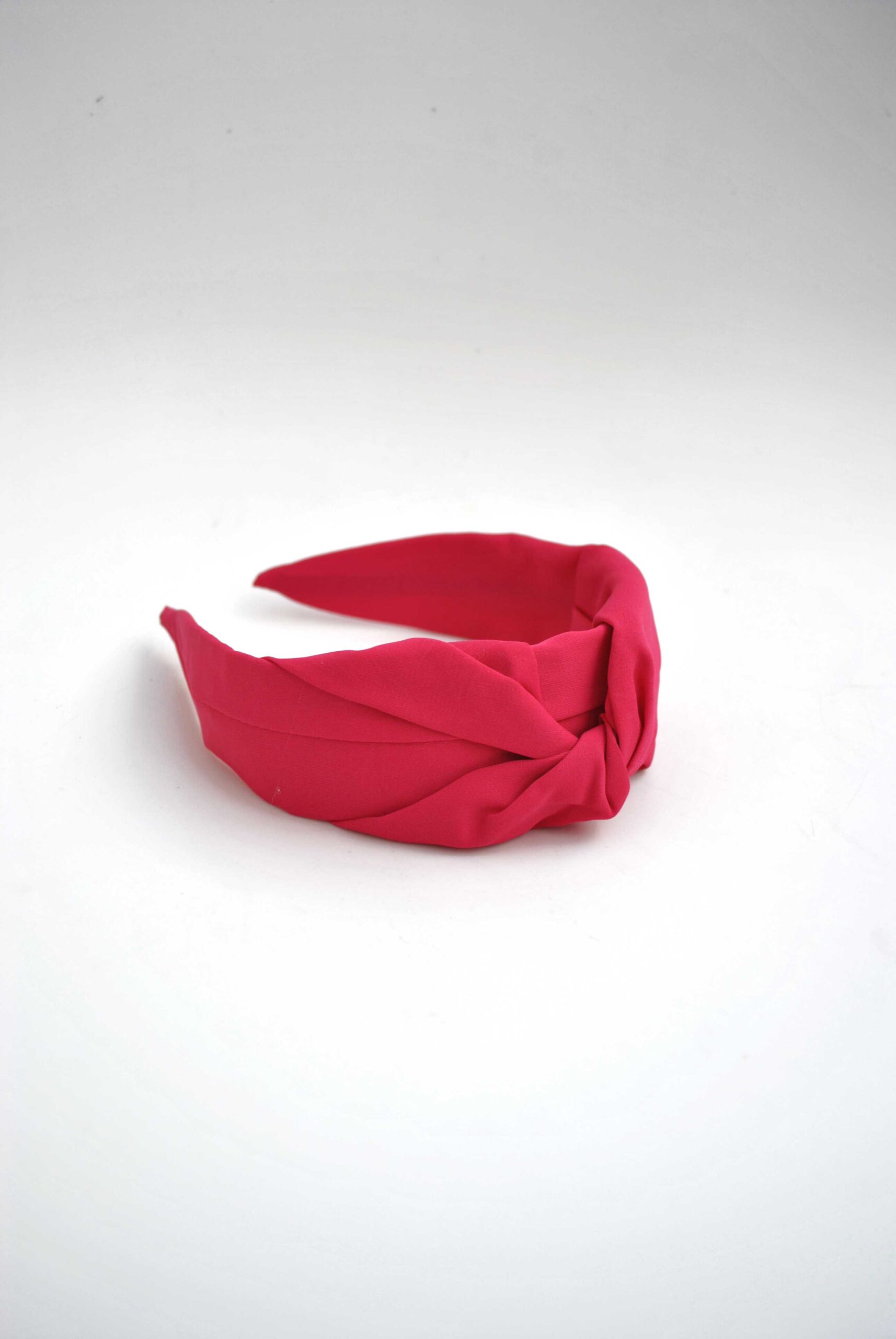 R03/5394 – Bonita diadema forrada en tela suave de color rosa fucsia con detalle central de un nudo, diseño fino y elegante