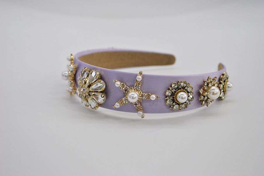 R02/4588 – Preciosa diadema joya de fiesta. Se trata de una diadema forrada en tela MALVA brillante y está decorada con perlas, cristales blancos y metal dorado.