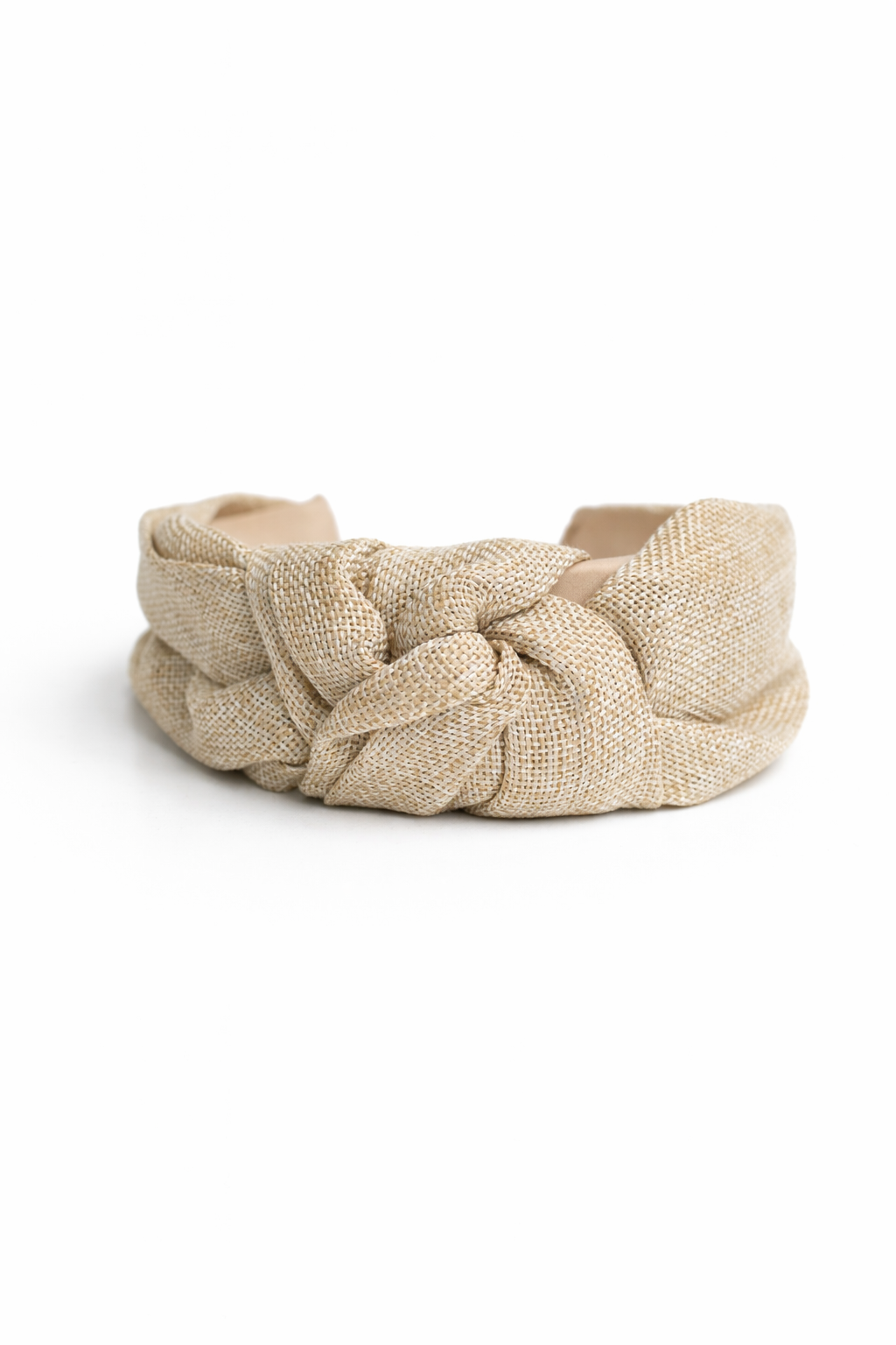 R04/5709 – Bonita y original diadema de fiesta color natural. Se trata de una diadema confeccionada en tela símil rafia con detalle central en forma de nudo. ¡Queda espectacular y muy favorecedora!