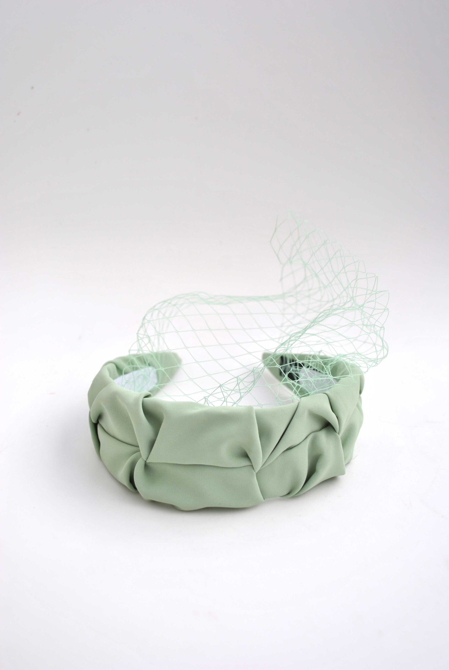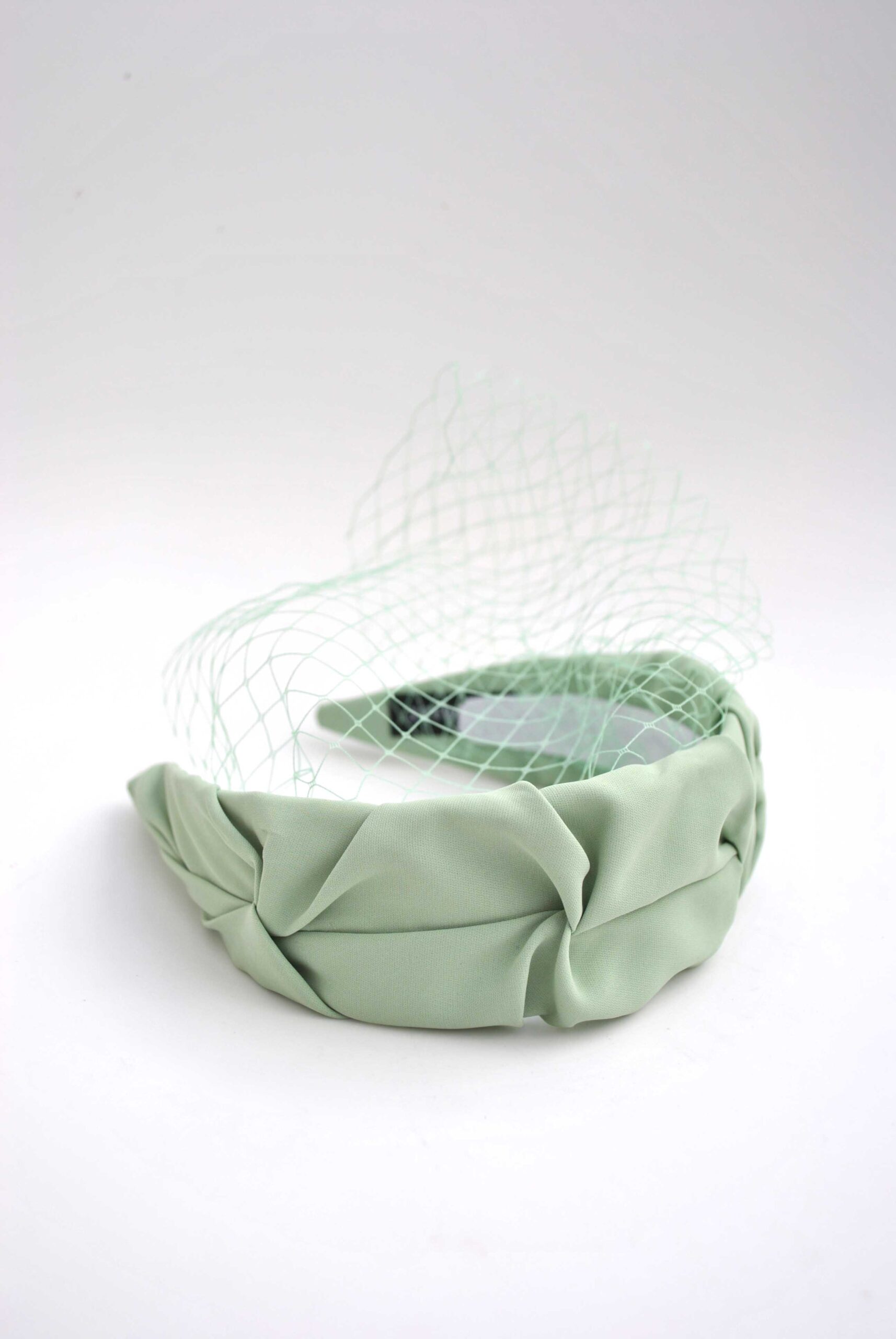 R04/5727 – Bonita diadema de fiesta o tocado verde menta. Se trata de una diadema verde menta forrada en tela con detalle central con un nudo y una elegante redecilla del mismo tono. ¡Queda espectacular!