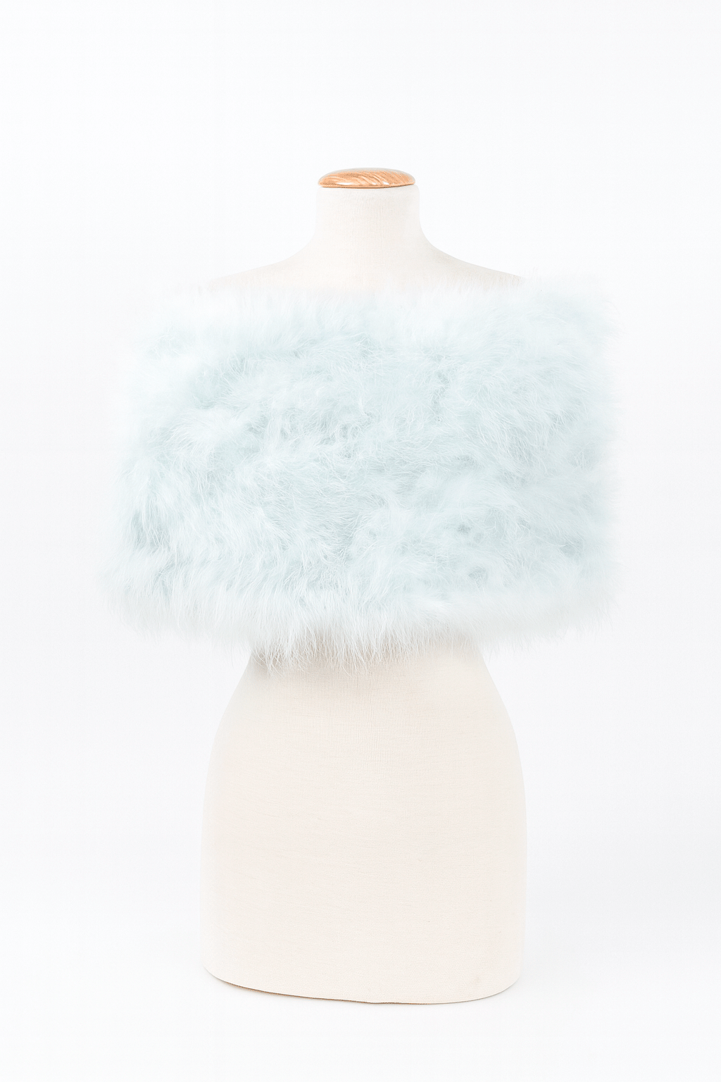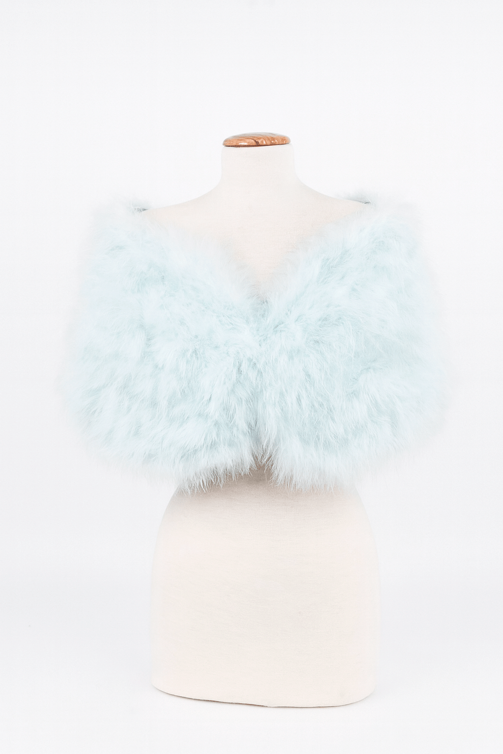 REF: 5789 – Capa o estola de fiesta, ideal para bodas y eventos especiales, fabricada a base de plumas naturales de avestruz en color azul cielo claro. Se puede llevar de hombro o bien, cruzada hacia un lado o bien recta a modo de capa. La estola consta del interior está forrado, es muy favorecedora por su vaporoso movimiento y cómoda de llevar. Dispone de dos pequeños broches para llevarla abrochada si así lo deseemos.